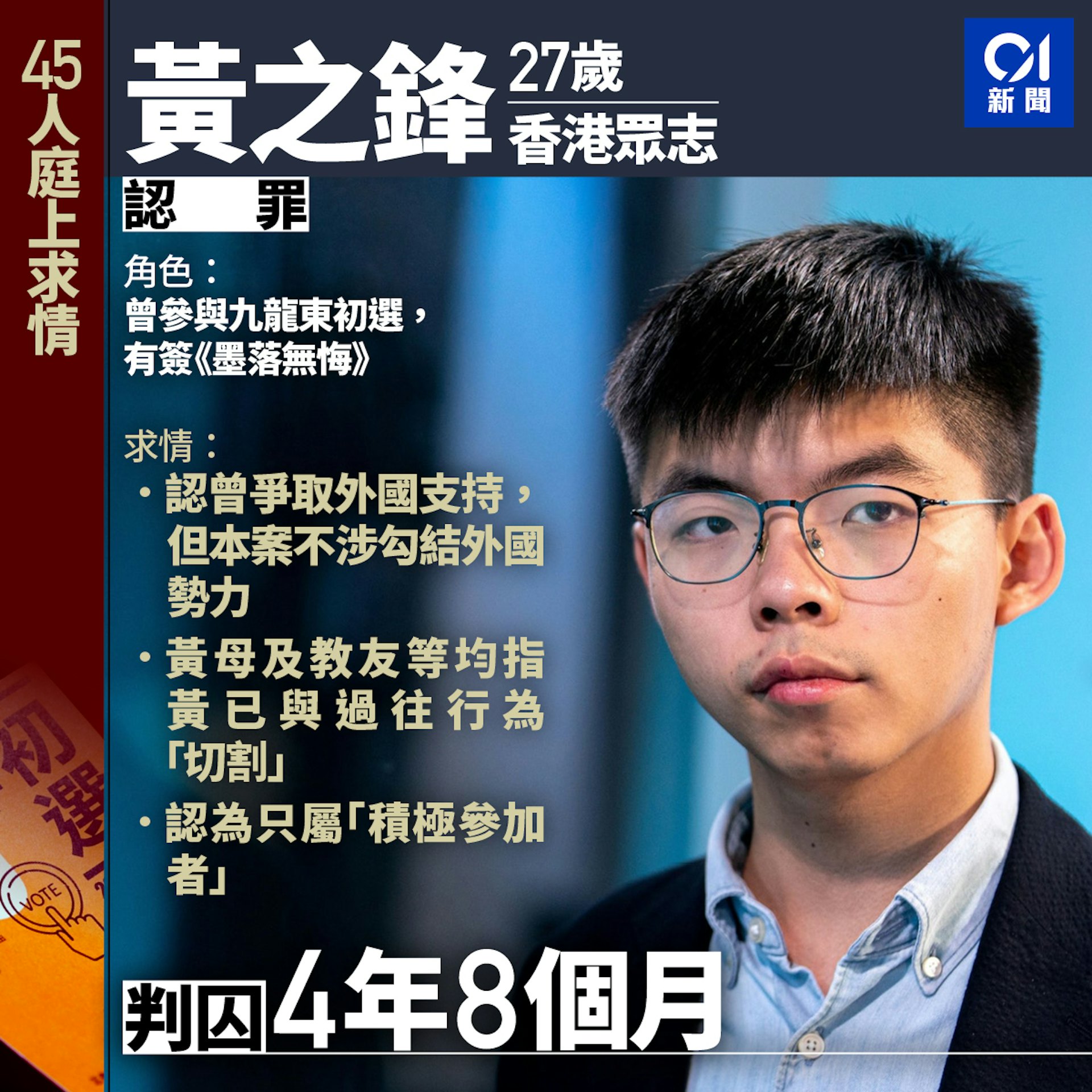; Z% g. }6 [7 G公仔箱論壇另外創立學民思潮、香港眾志的黃之鋒,判監4年8個月。判辭指黃之鋒於2016年至2023年間有多項案底,又認為他是案中的「積極參加者」,因為其認罪扣減三分一刑期。不過,因黃之鋒求情時無提及,他是因對法律的錯誤理解而犯案,加上黃之鋒是在其他法庭案件獲保釋期間犯下47人案,所以無獲更多刑期扣減。os.tvboxnow.com3 ^# O$ h- L9 Z) \3 e) C; I