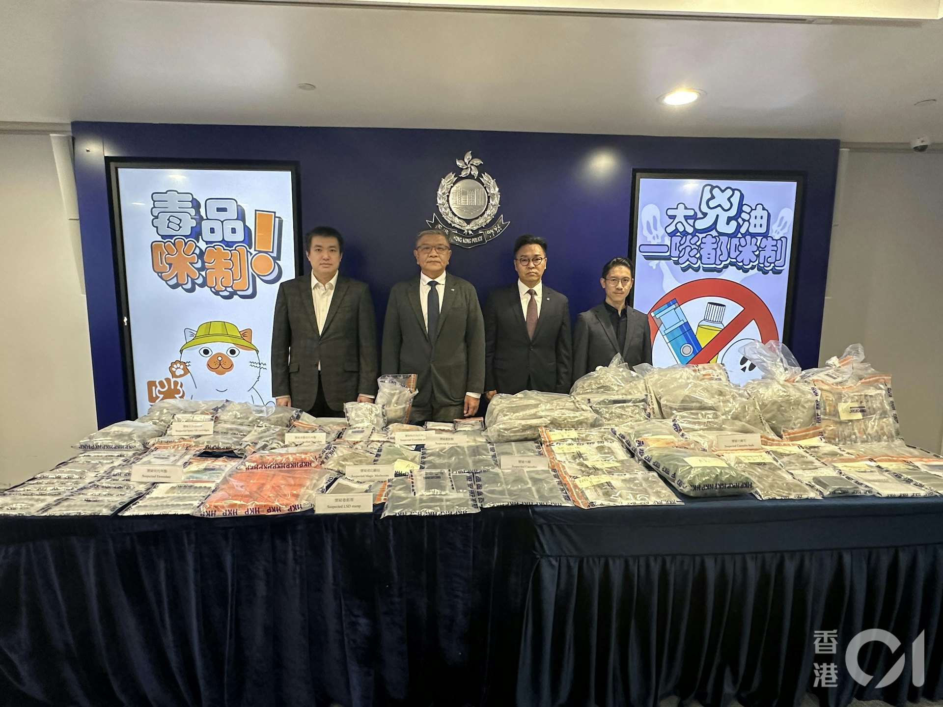 / m" P; g1 ~9 r# ? }tvb now,tvbnow,bttvb行動中檢獲多種毒品及第1部毒藥依托咪酯(即「太空油」),估計總市值約3,700萬元。(黃煦緻攝)