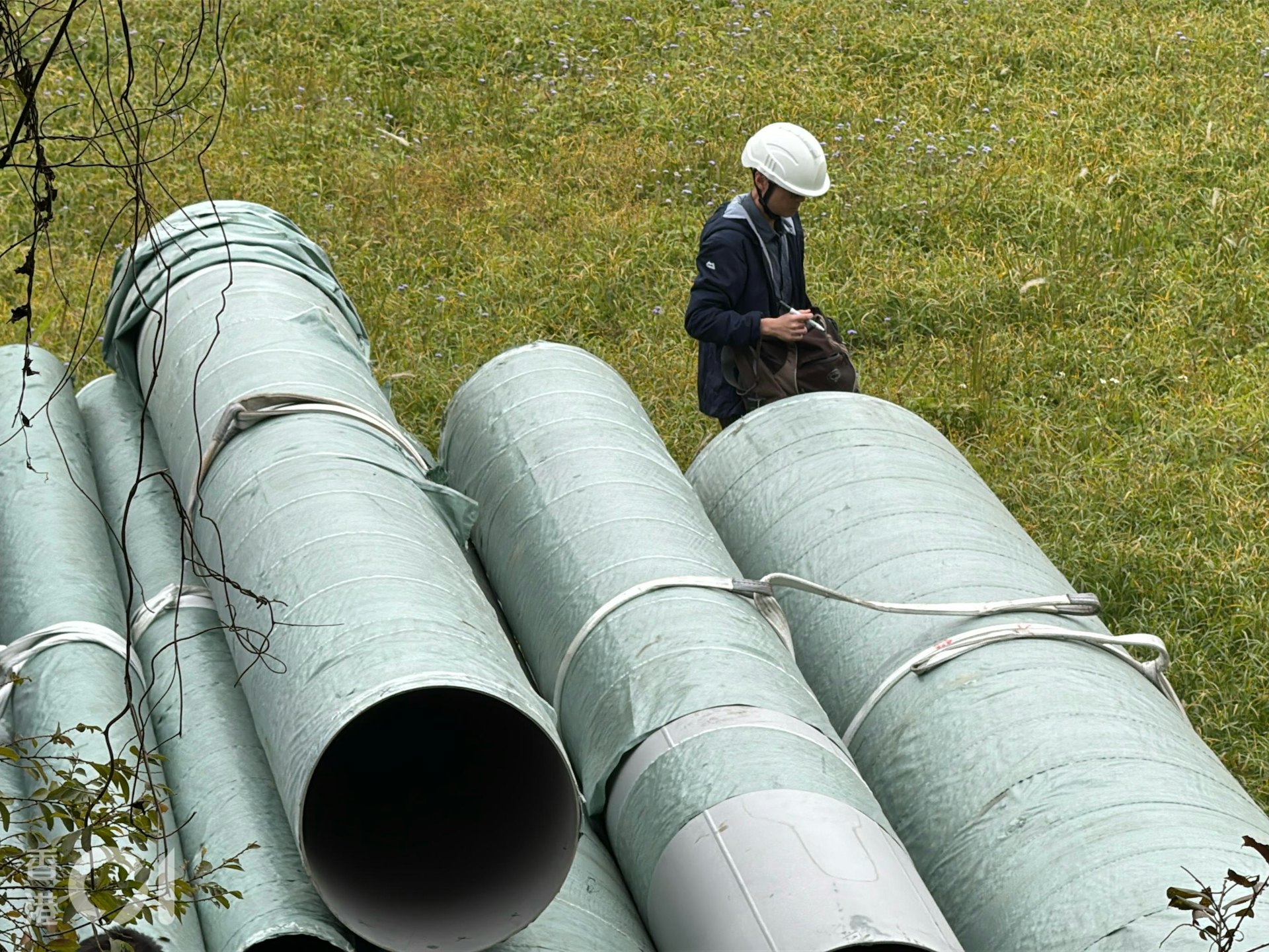一輛貨車到上水蓄洪池落貨,搬運水管時用木條借力,擊中死者頭部。相信是渠務署的人員到現場,向工人了解事件,並在繫上搬運帶的一堆水管前拍照搜證。(蔡正邦攝) |