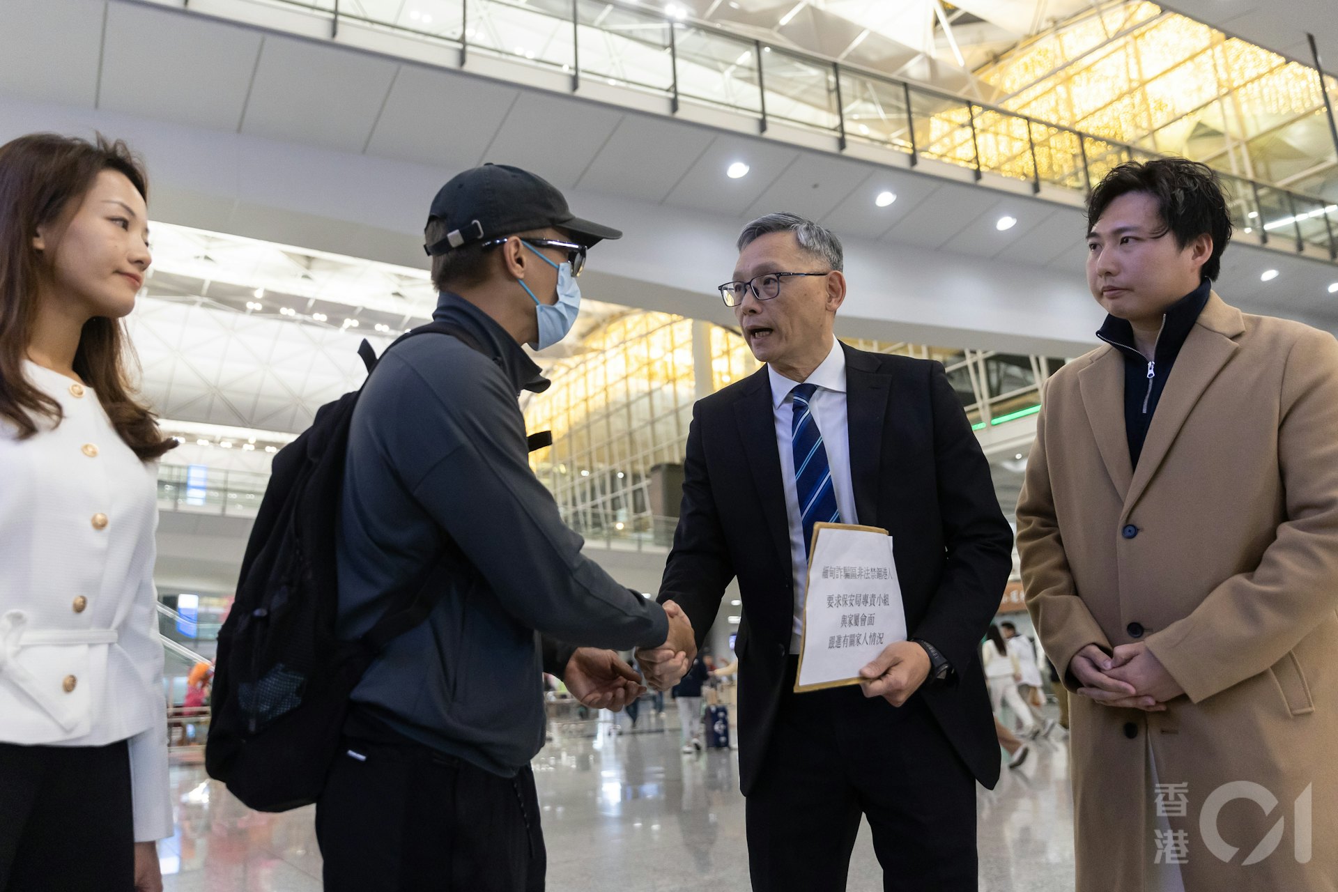 其中一位被禁錮港人成功獲救,下午安全返港。事主被禁錮期間因不達標多次遭毒打、扣膳食。(梁偉權攝)3 v% L( M% g/ w3 s) f! j& M5 A