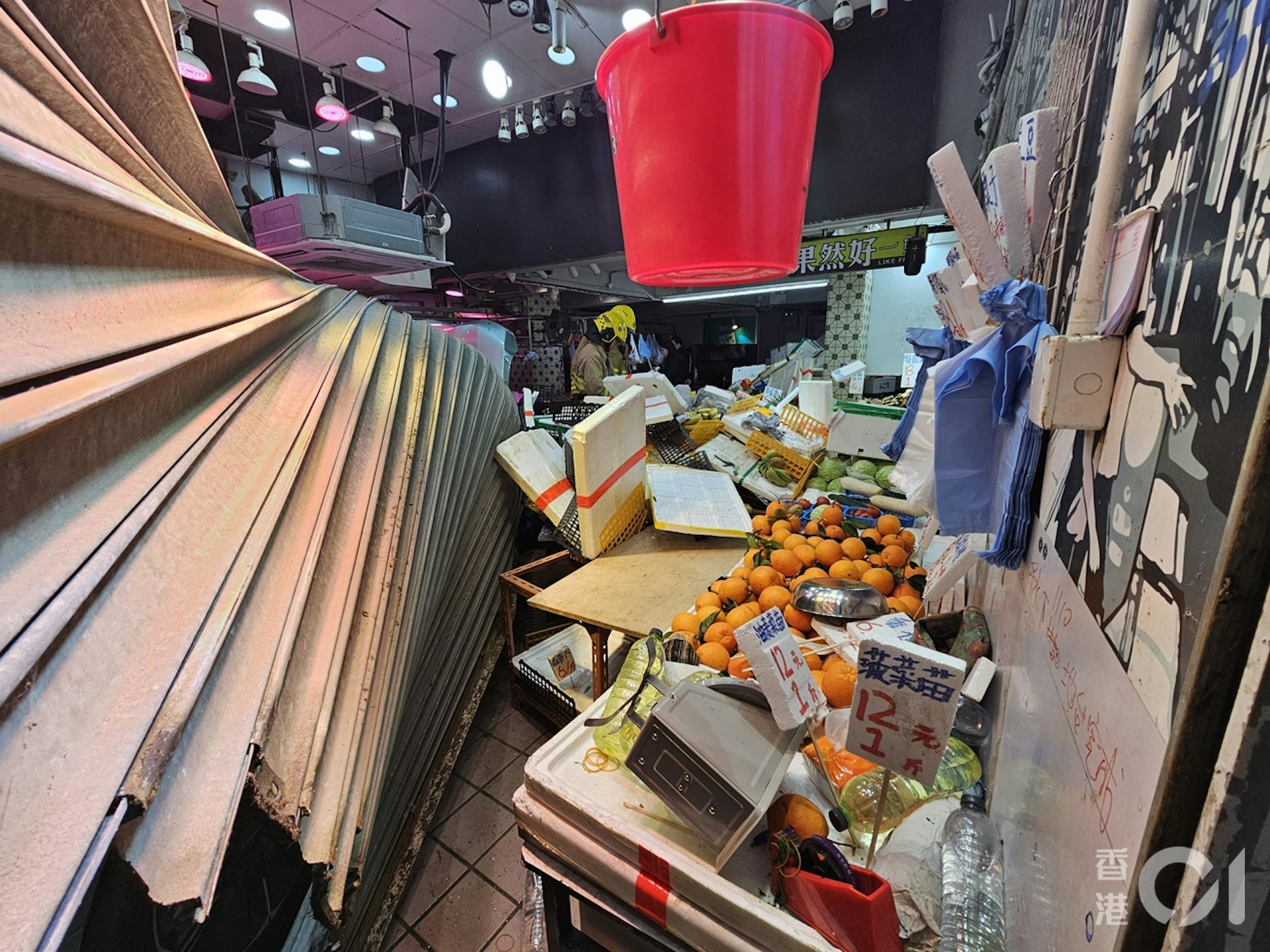 涉事七人車插入豬肉檔內。(梁偉權攝)