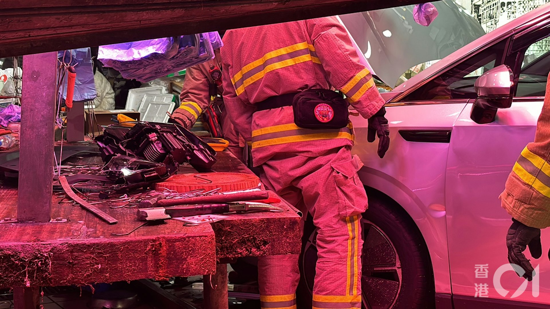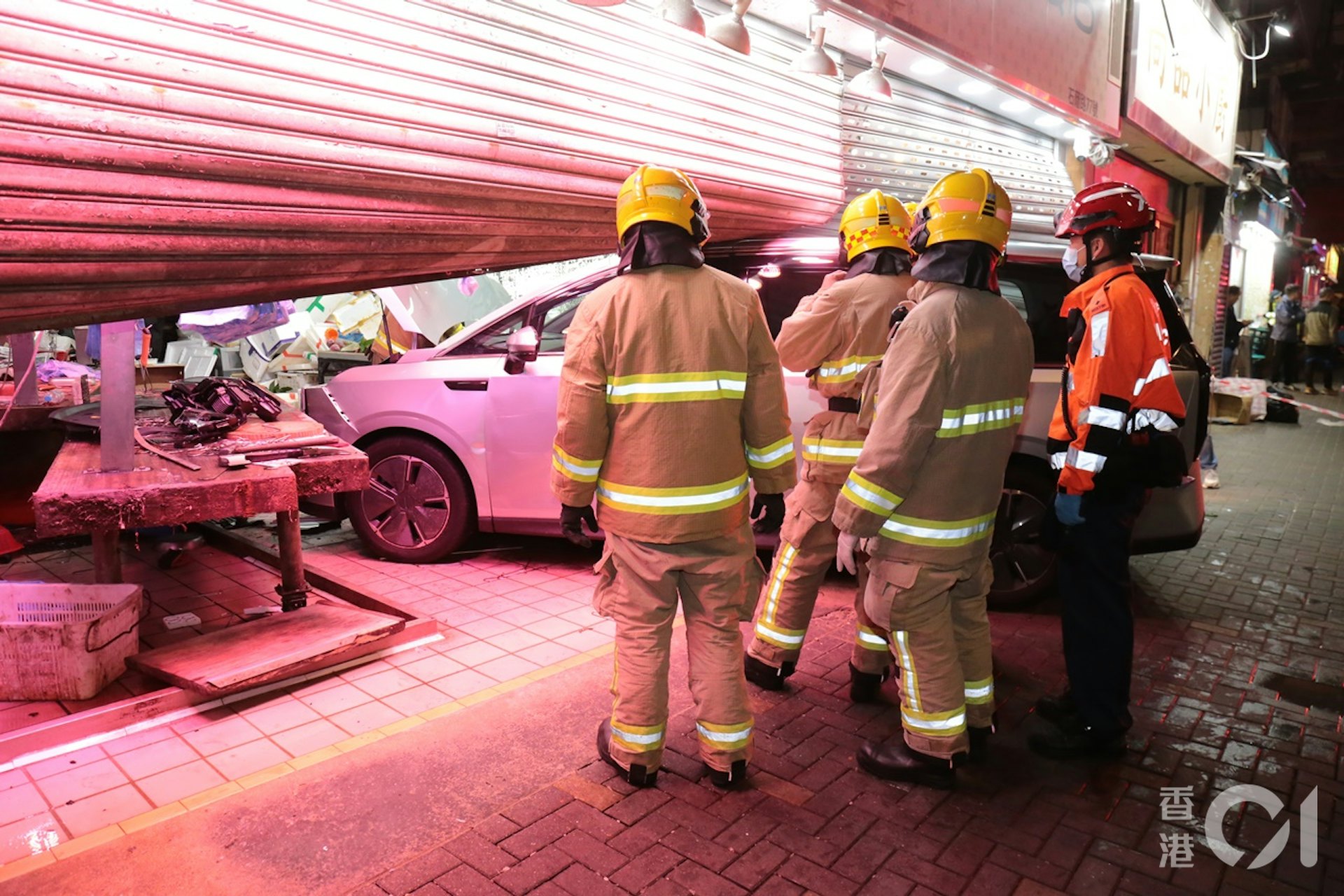 / w/ B. m7 d8 o3 Y& a3 o涉事七人車撞入豬肉檔內。(梁偉權攝)