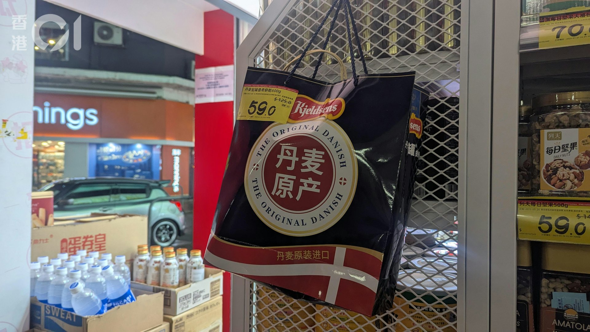 內地攻港超市「HotMaxx好特賣」的葵芳分店,近日以59元優惠價出售「丹麥藍罐曲奇」。貨盒上註明原產國為丹麥,最佳食用日期已過,為今月14日。付款時,店員將曲奇放在紙袋內。紙袋以英文及簡體字標明「丹麥原產」及「丹麥原裝進口」。公仔箱論壇. n3 U) B8 P% z/ k) ?1 J L' M