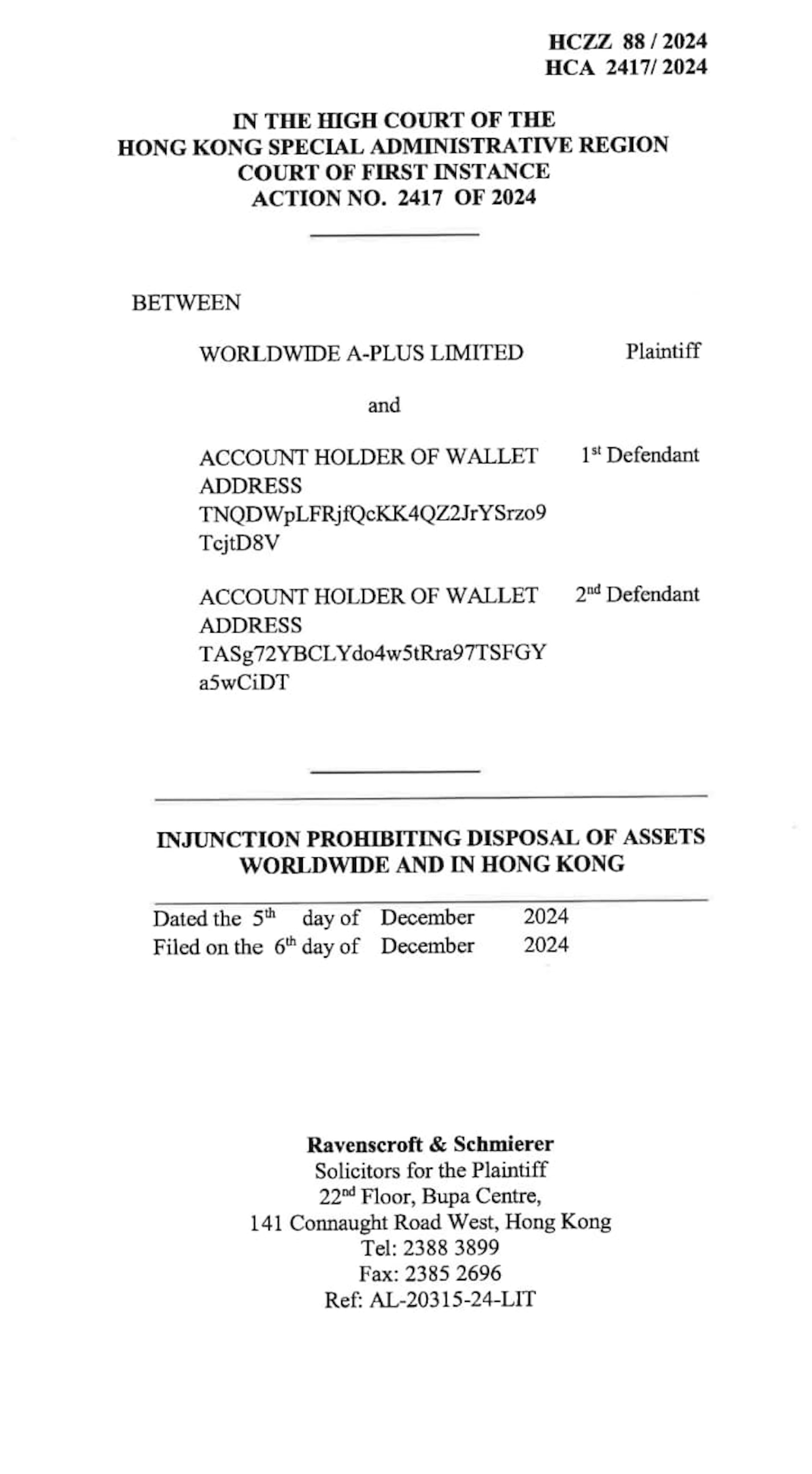一間名叫Worldwide A-Plus Limited的公司於2024年12月初入稟高等法院,指被偷去260萬泰達幣 (USDT),即美元等值加密貨幣(折合約2024萬港元),要求向兩個持有涉案贓款的Tron(波場)加密貨幣錢包地址的持有人頒布禁制令,凍結錢包中的資產。TVBNOW 含有熱門話題,最新最快電視,軟體,遊戲,電影,動漫及日常生活及興趣交流等資訊。+ ]6 {( a, y k+ T