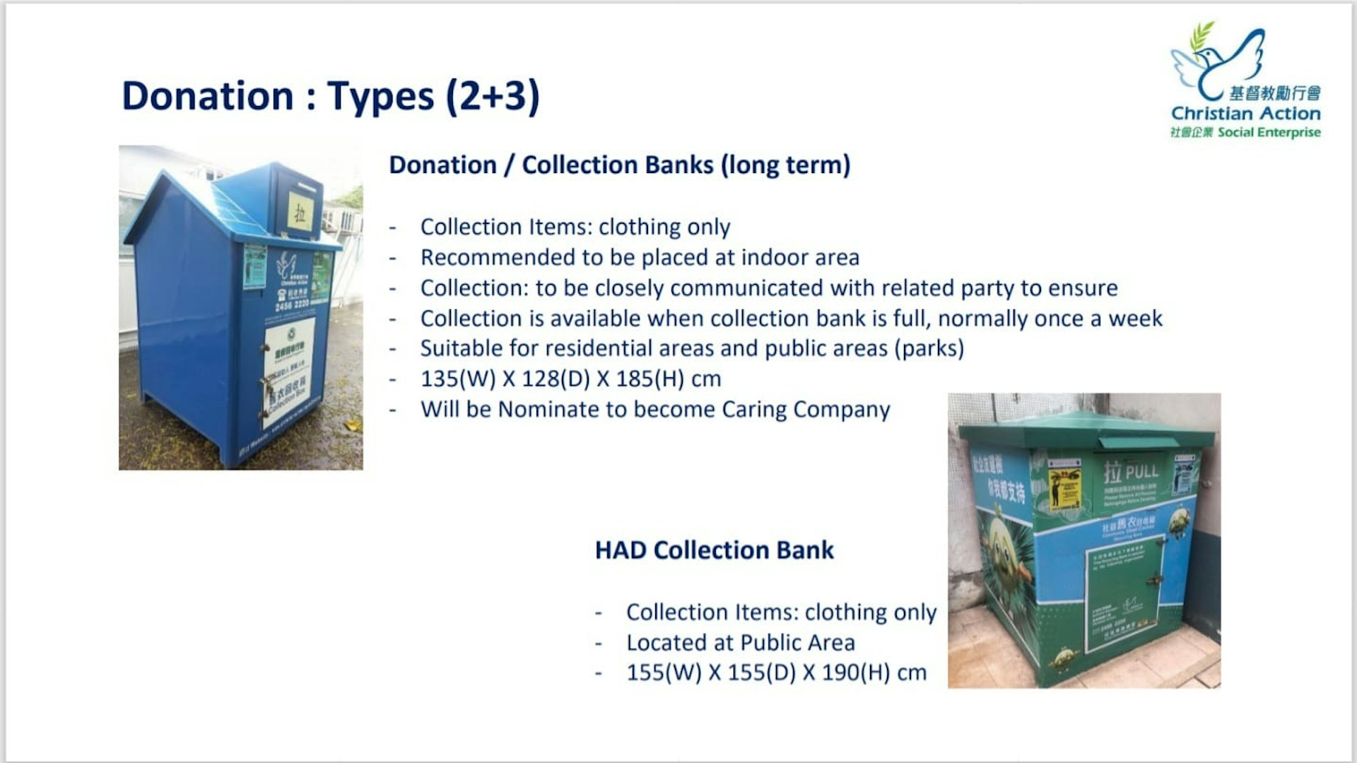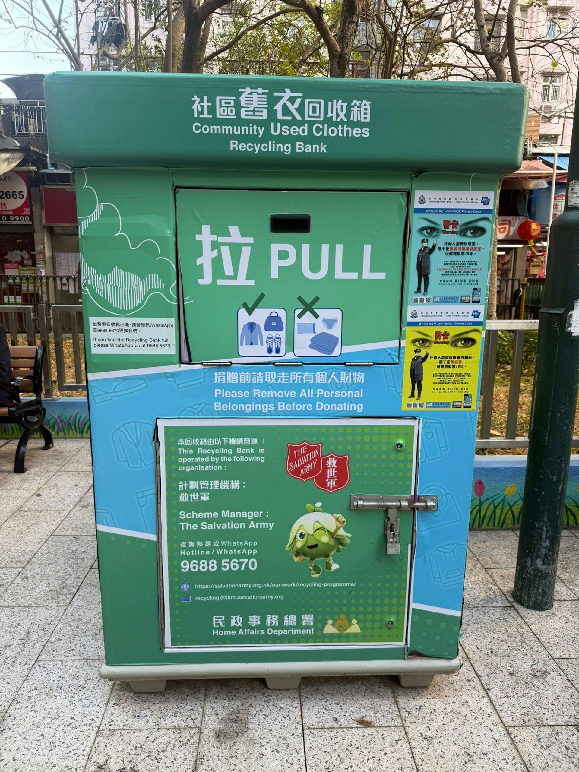 - `# g ?- H; q* H公仔箱論壇目前在公眾地方、公共屋邨及私人屋苑各有不同設置舊衣物回收箱的途徑。在公眾地方方面,民政事務總署自2006年起推展的「社區舊衣回收箱計劃」,目前計劃下有四個管理機構,包括香港地球之友、基督教勵行會、救世軍及長春社,機構亦會將不少一半的回收箱分配給其他團體營運。