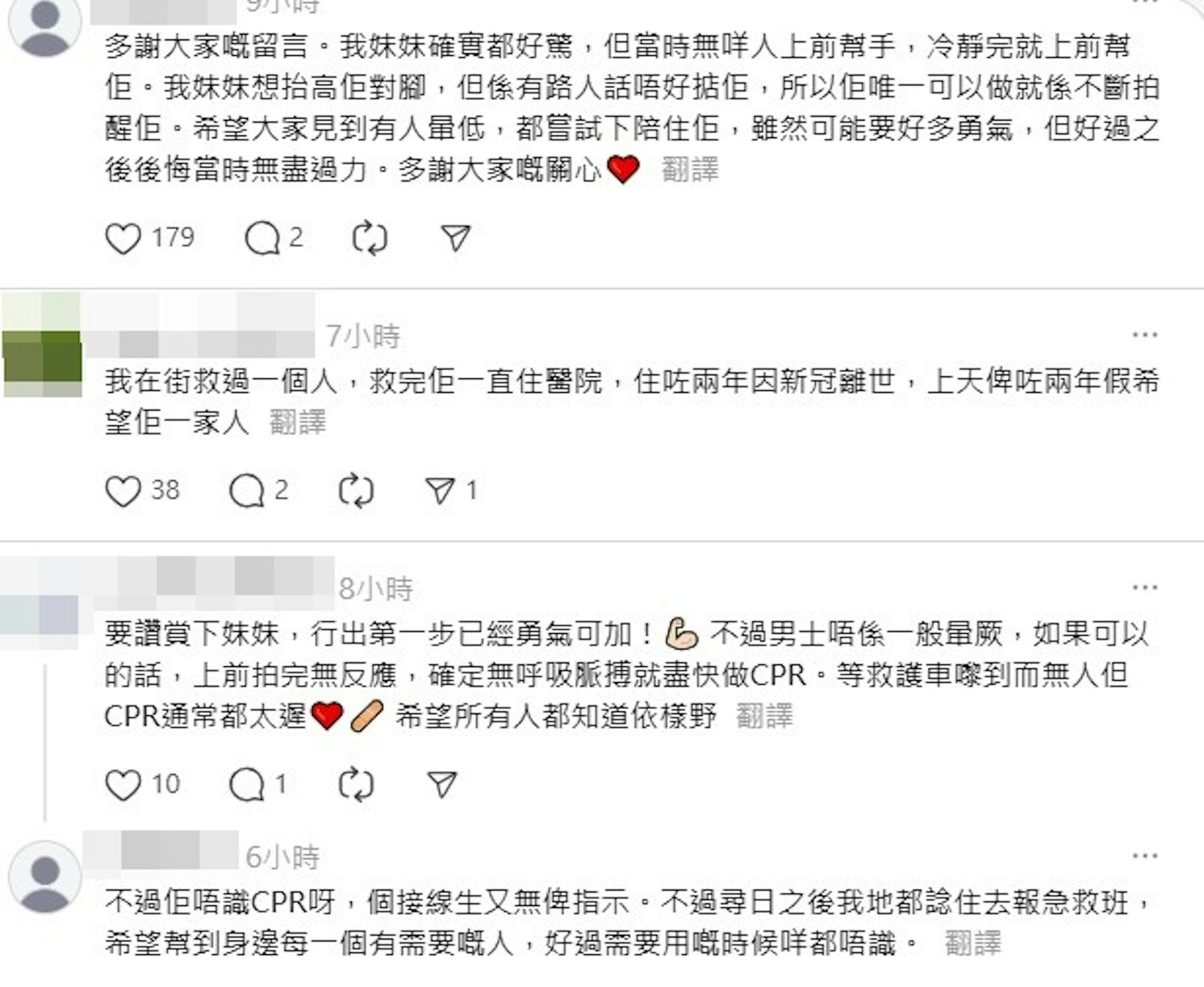 有關帖文引起網民一面倒留言大讚,「你阿妹好好,佢(死者)一定感受到」、「感謝你妹妹及途人樂於伸出援手!」、「肯幫手已經好勇敢,有急救牌都未必敢幫手」、「好人一生平安」。亦有人加以安慰,並提醒家人要多加留意,「可以留意下妹妹, 目擊生命流逝衝擊都好大。」