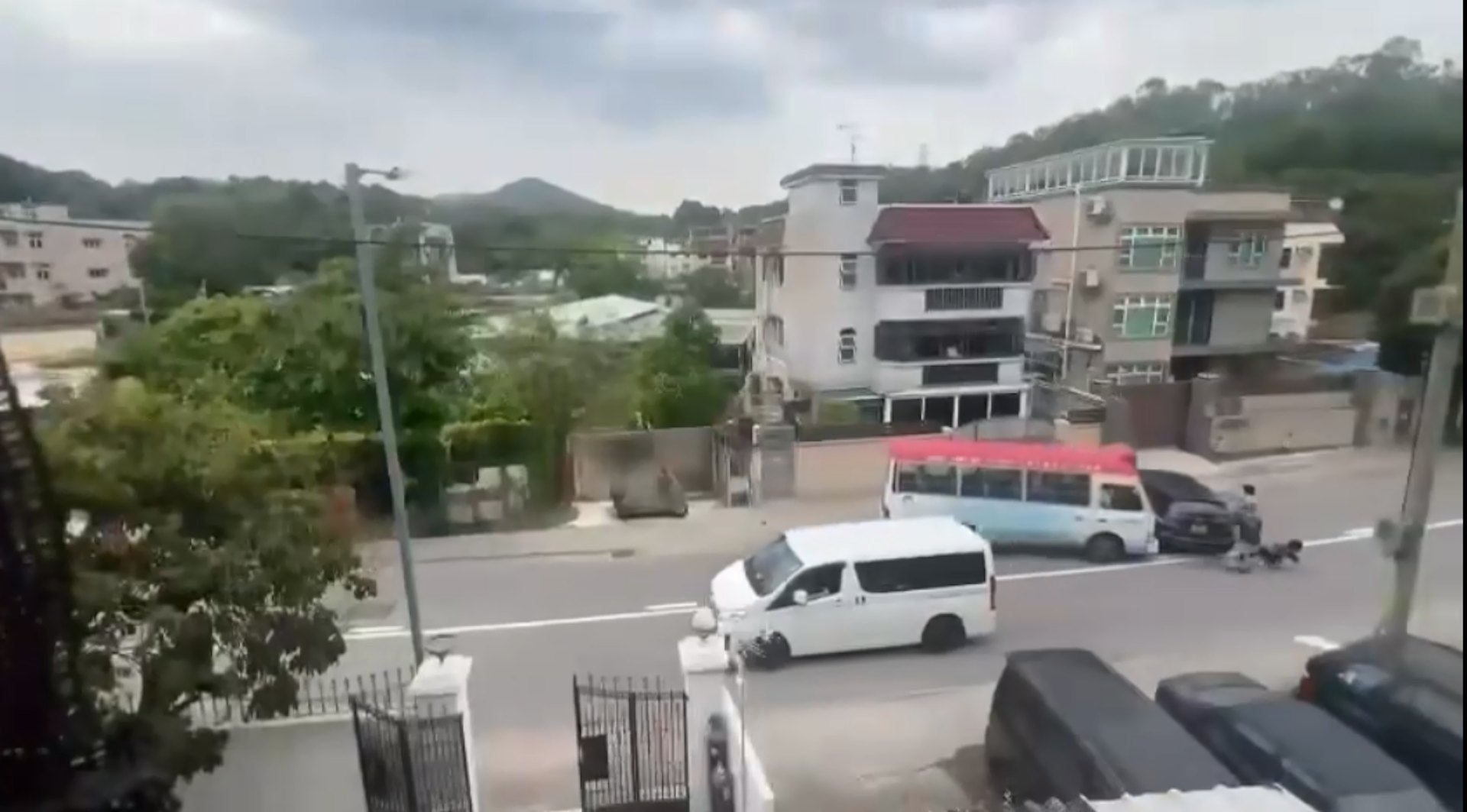 地點在元朗大棠路270號對開。影片一開始見5名男子,將黑色私家車車橫亙往大棠方向路段,下車圍在一輛紅VAN前面,似有爭執。紅VAN突然駛後,再踩油衝前撞向私家車。站在私家車後方的3名男子見狀避開,其中一人失平衡倒在對面線,手上鐵通跌在地上,發出聲響。