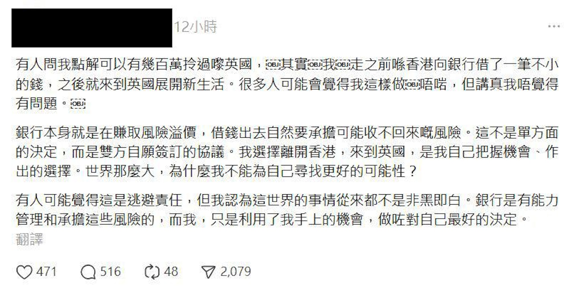 ! `) [: u# _& H! S港男自曝借香港銀行巨款移民英國不還錢