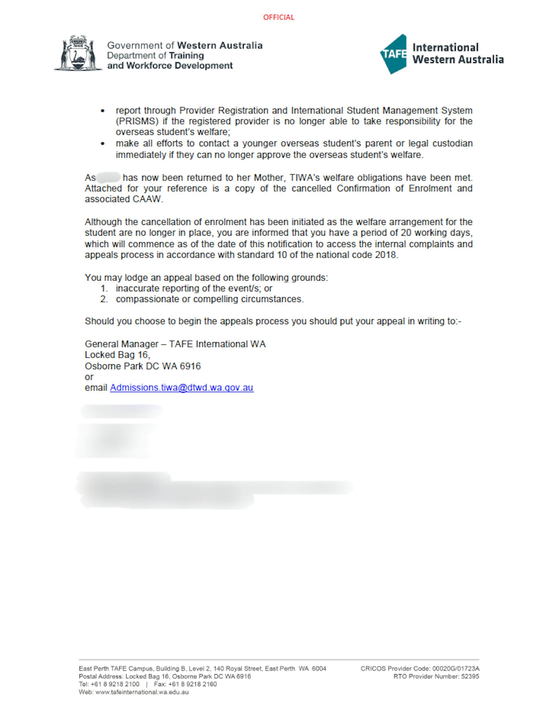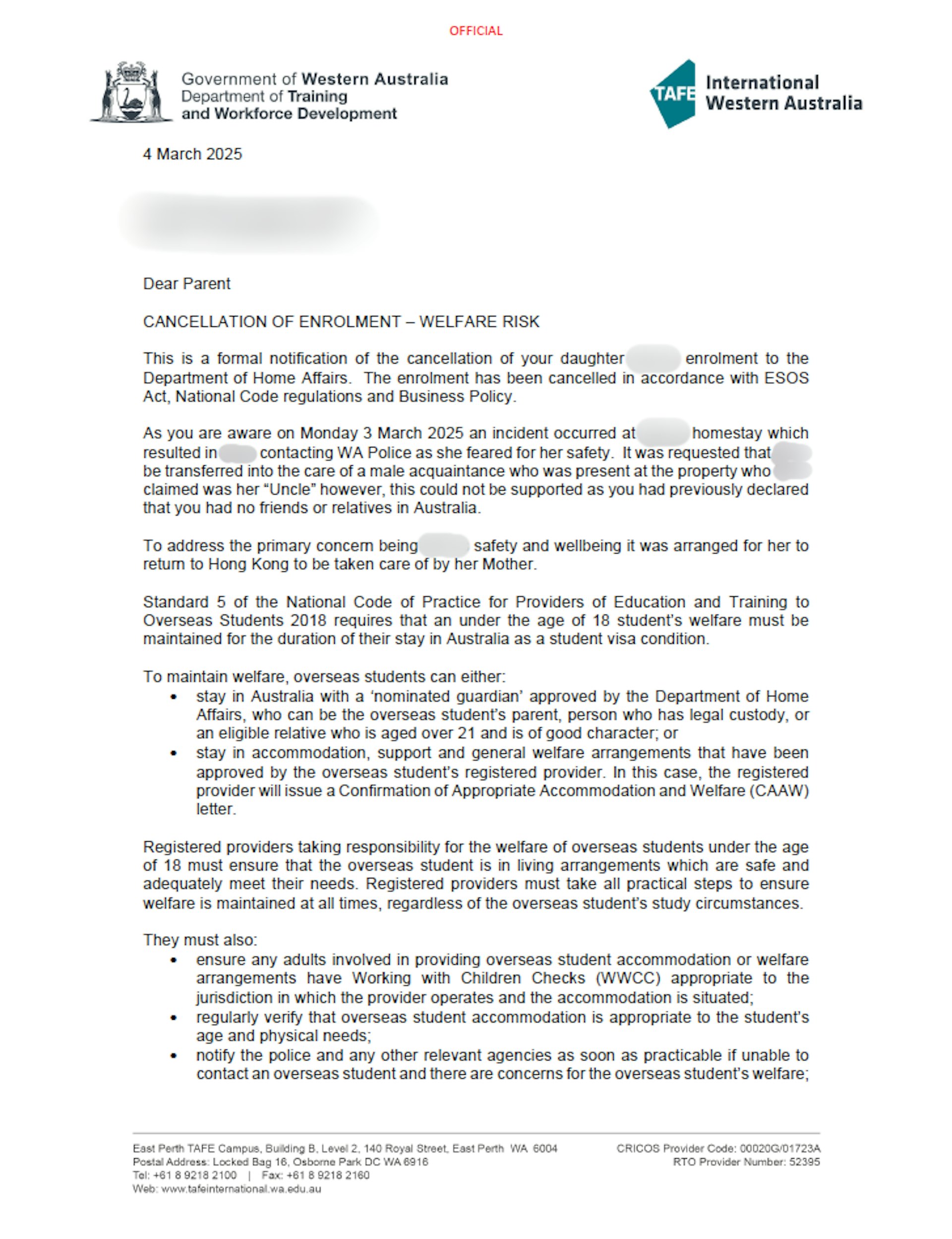 8 u T+ _; |6 Q l( U; O事發翌日,事主上機回到香港,陳太同日收到由TIWA寄出的電郵,包括取消其「入學確認書」及「住宿與福利確認書」,並引述澳洲高等教育品質標準署(TEQSA)於2018年制定的海外學生教育和培訓提供者國家行為守則,指要保障18歲以下的學生的福利,海外學生需要一個獲內政部核准的監護人,或入住獲確認的宿舍。% H. L$ D: c& t0 K9 T, z+ l1 Y