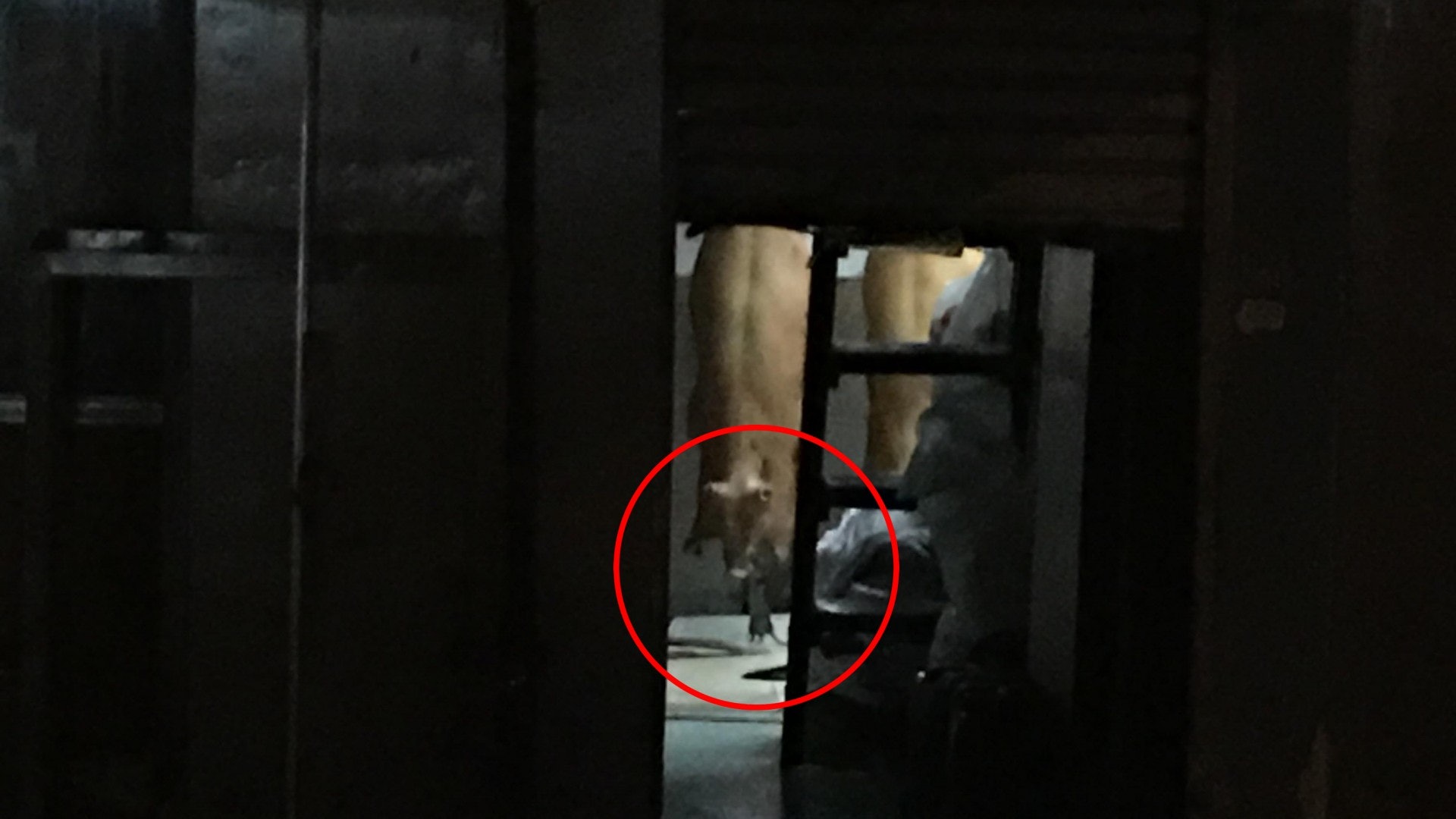 1 G# p% Y4 `6 N8 n4 m9 M7 l9 C司徒先生上星期(17日)就拍到大X燒臘工場内有老鼠拉著燒豬「做gym」,非常恐怖。(司徒先生提供)