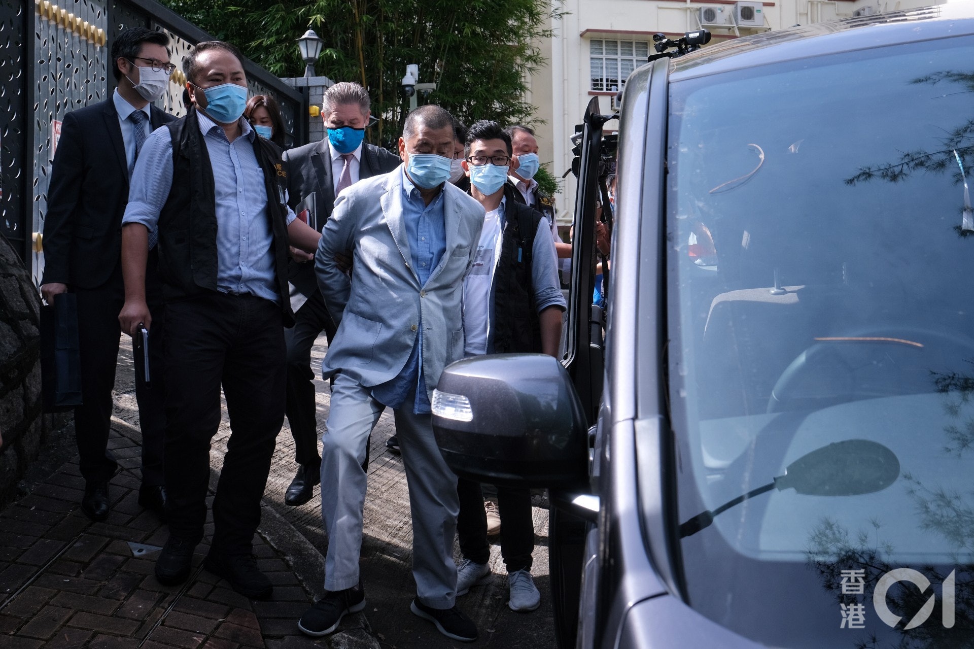 2 k9 n1 U9 G1 W/ ^+ D% H9 M" D【黎智英被捕】壹傳媒創辦人黎智英戴上手銬,由警員押往警署。(羅君豪攝)