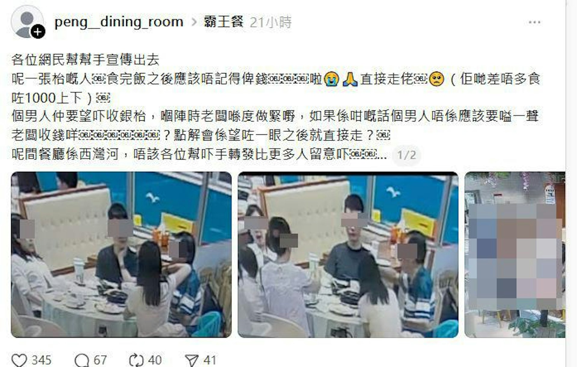 ! L( v# t/ u+ f! W- {+ y' V西灣河鵬翔廚房於社交平台發布閉路電視(CCTV)影片,指日前有一家6口到店用餐,埋單約1,000元,卻沒有付款就離開。(Threads@peng__dining_room)os.tvboxnow.com/ t. E, C5 n5 p6 ~