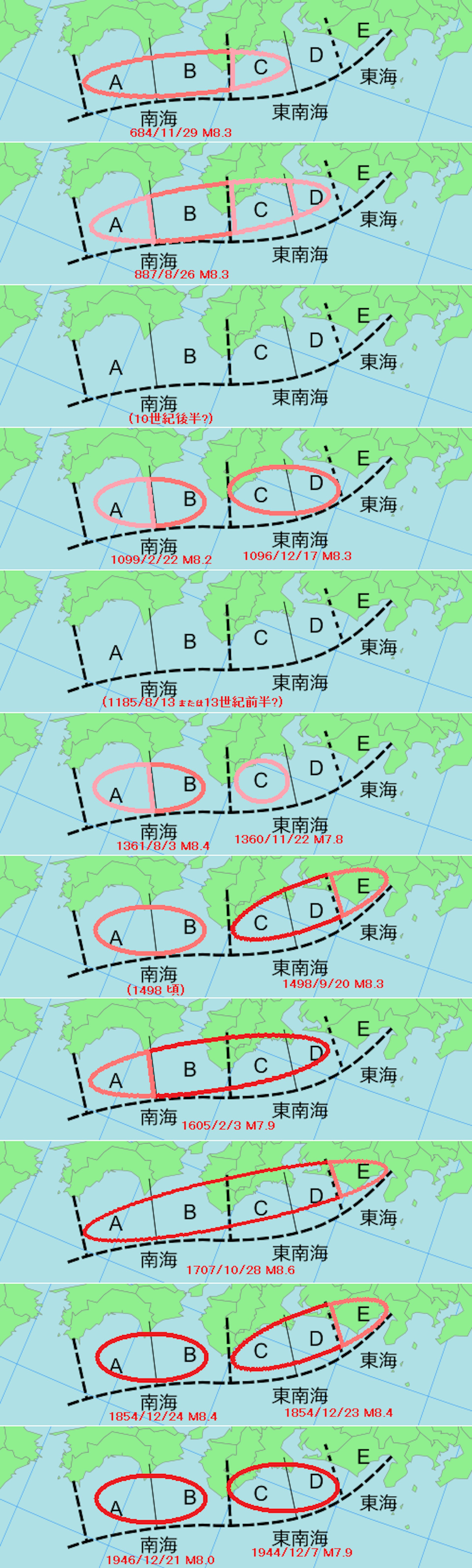 ( ~3 G) X9 Z6 H) z( Q- ^, {公仔箱論壇根據日本政府的地震調查委員會報告,自 684 年的白鳳(天武)地震以來約 1400 年間,南海海槽每隔 100 至 200 年便發生 8 級或以上的巨大地震,其中最大的是 1707 年的 8.6 級寶永地震。同時,海嘯沉積物研究亦透露了過去幾千年的地震歷史,顯示大約每300至600年會發生一次規模相當於寶永地震的海嘯。