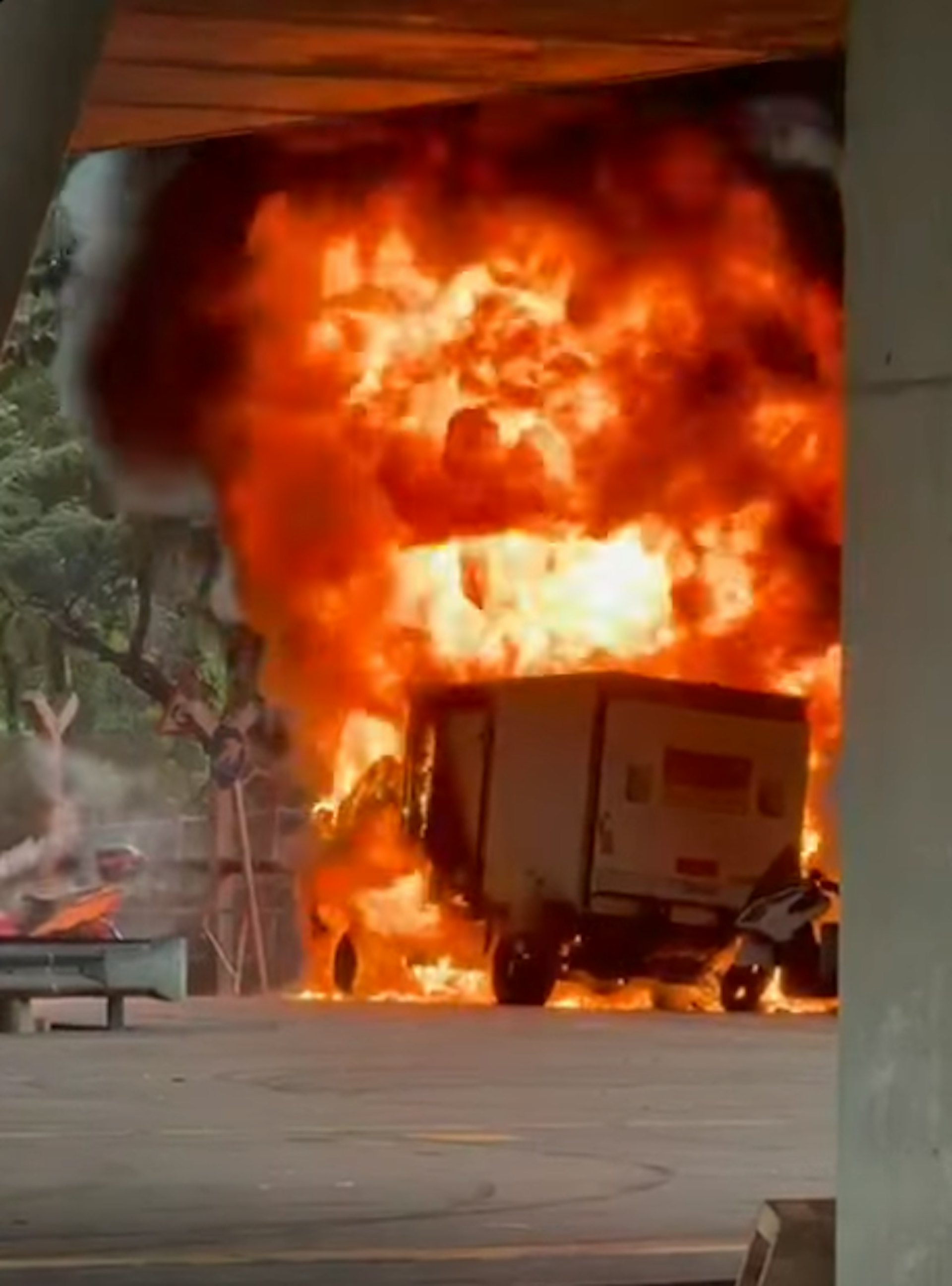 葵涌貨櫃碼頭南路一個停車場今午(17日)有貨車起火,傳出爆炸聲、濃煙沖天。警方與消防傍晚交代案情時指,在涉事貨車上發現油缸、油喉及油槍,現場亦發現易燃液體焚燒痕跡,相信貨車為非法加油站,正追緝一名懷疑涉案的女車主。+ m$ _) [6 n8 \2 l* f