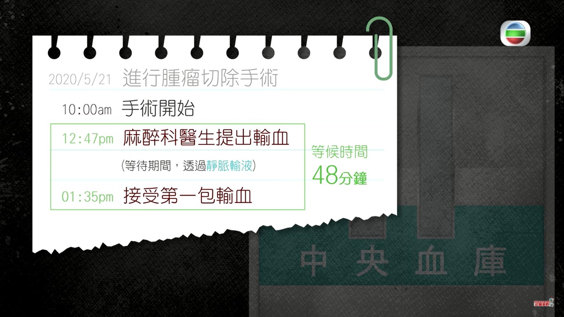 ' _7 {3 k; v) B5 c天瑜等了48分鐘才獲輸第一包血。(節目截圖)