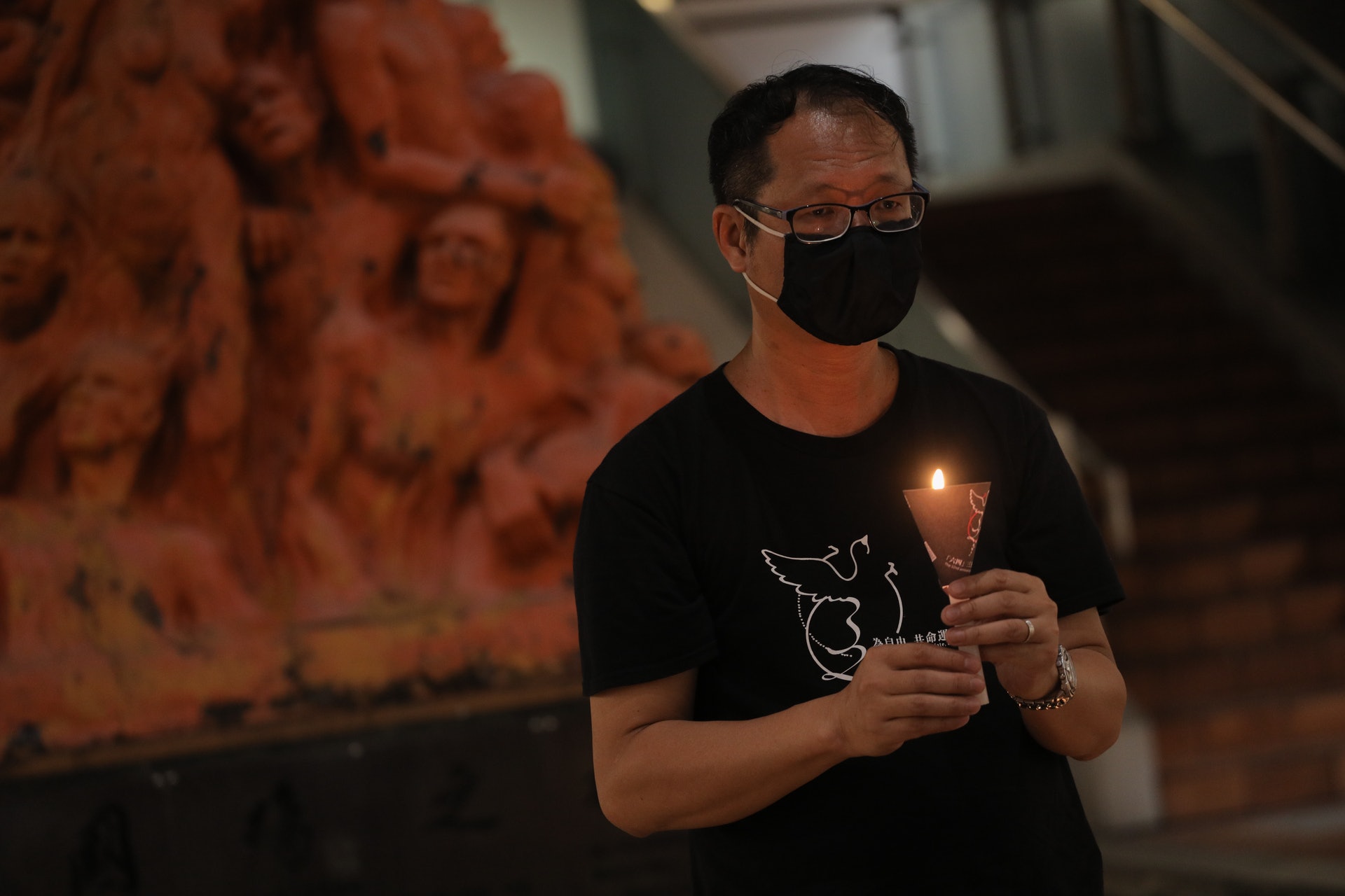 " D; a; }1 n6 S/ {( q公仔箱論壇支聯會在港大國殤之柱默站。(羅國輝攝)