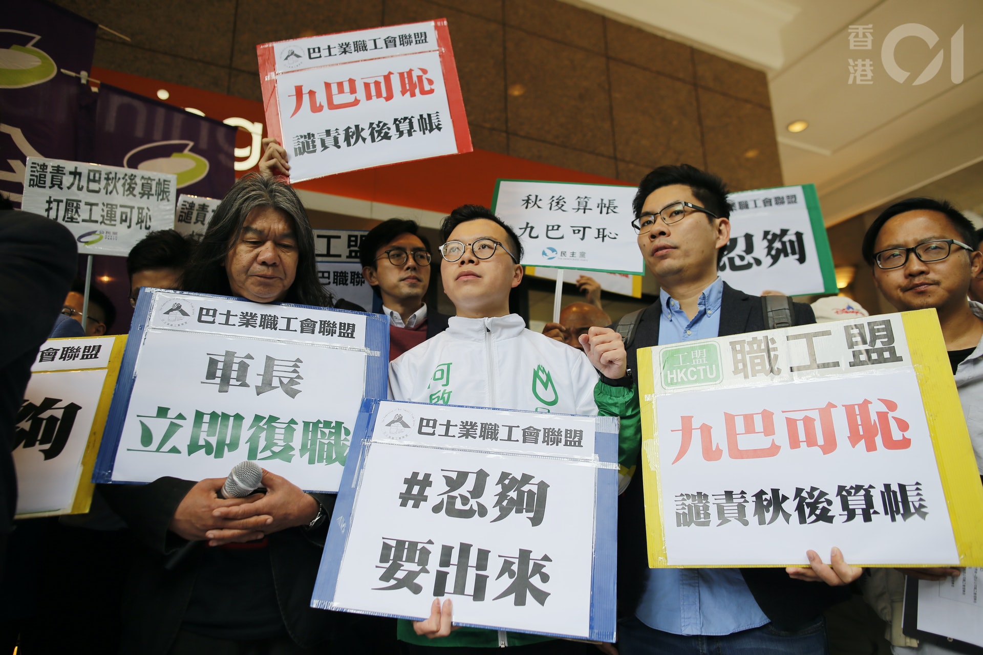 , a. u6 t' e$ S% }6 R7 E# ztvb now,tvbnow,bttvb2018年3月7日,職工盟等泛民組織到九巴總部抗議,要求恢復發動工業行動的女車長葉蔚琳職務。葉蔚琳因不滿新推出的薪酬計算調整方案,未能滿足2004年6月後入職員工需要,組織「月薪車長大聯盟」抗議方案並發起罷駛,其後有指九巴高層得悉大聯盟支持度有限,便解僱大聯盟相關的員工。(梁鵬威攝)