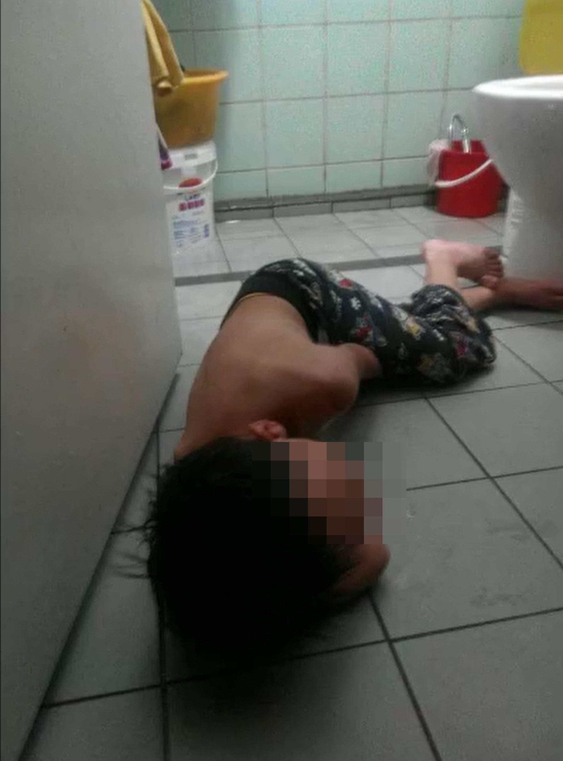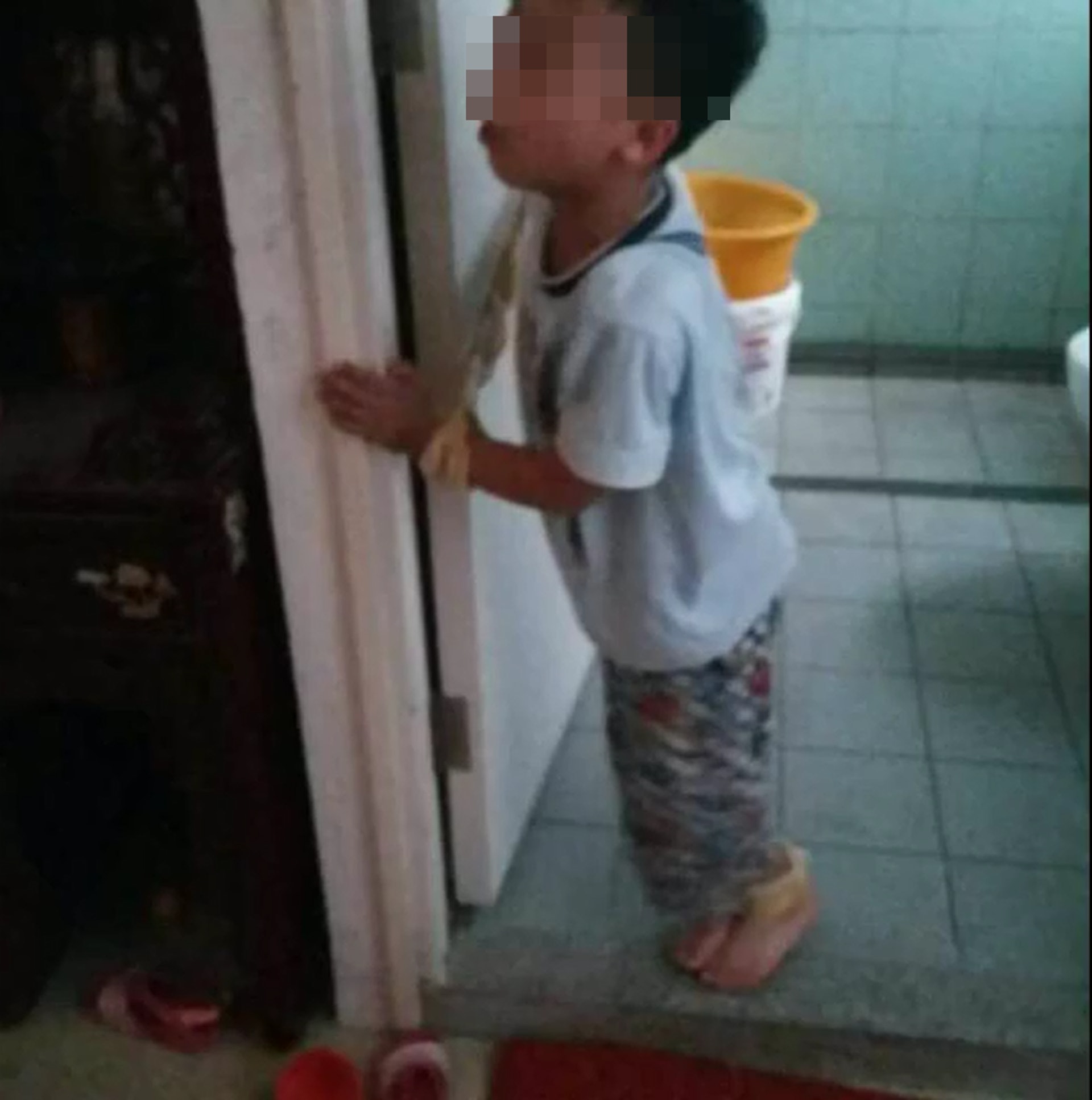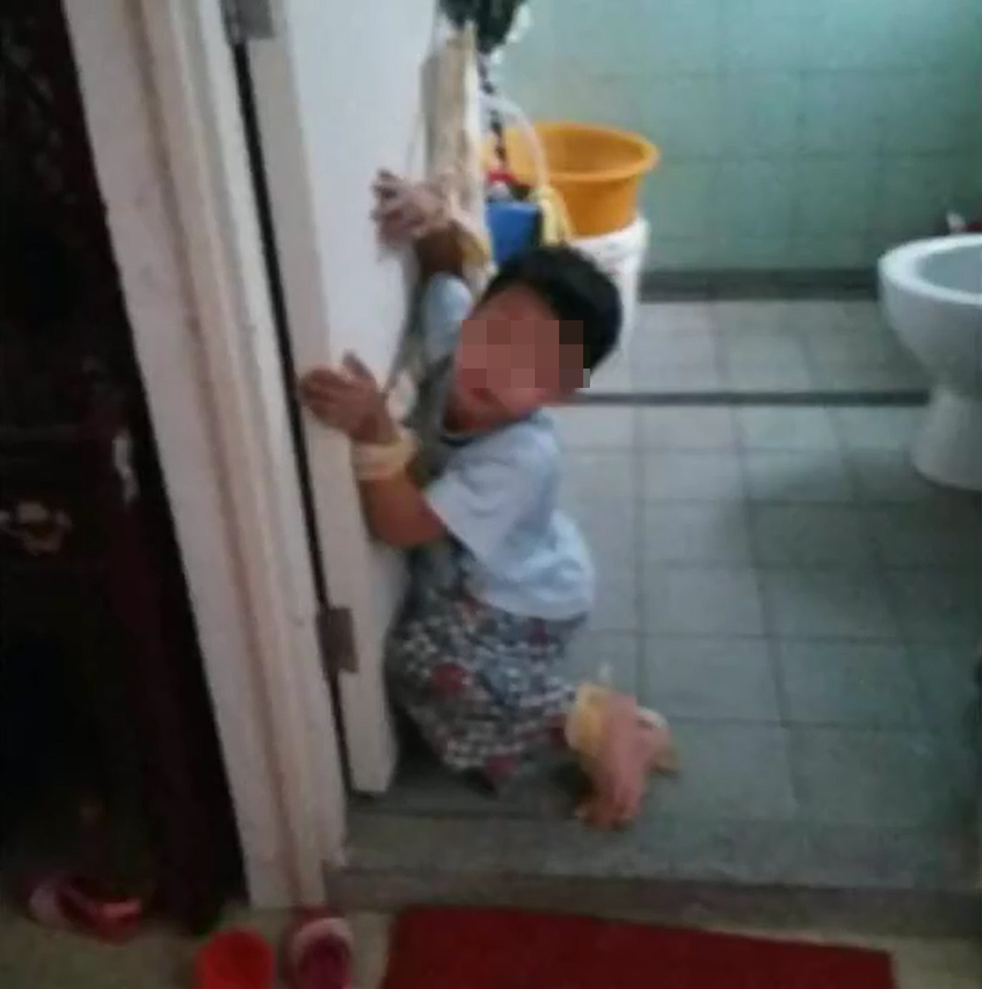 * E8 ]3 g* } }2 j) H公仔箱論壇男童雙手雙腳被綁,跪坐在一個住宅單位的廁所內。