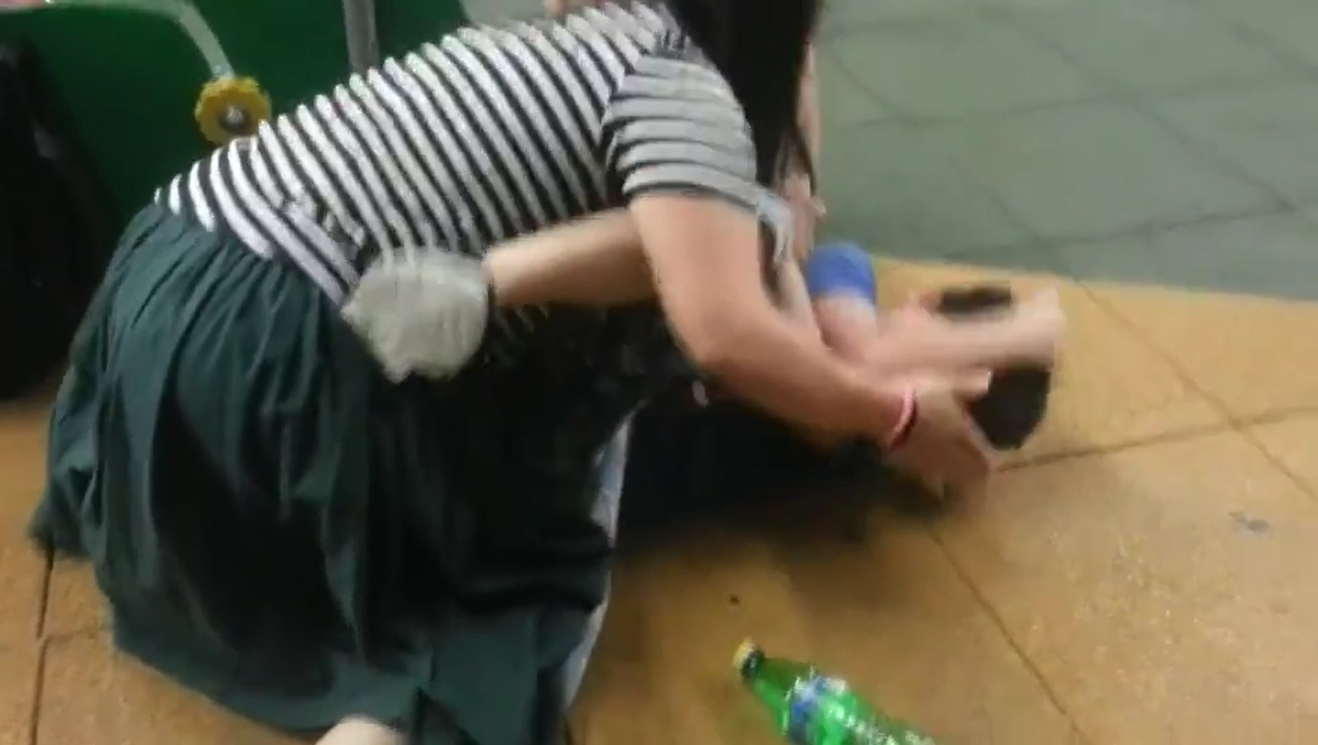一名女子連續掌摑瑟縮地上的男童。$ C- K9 c3 H) [, t/ G1 z