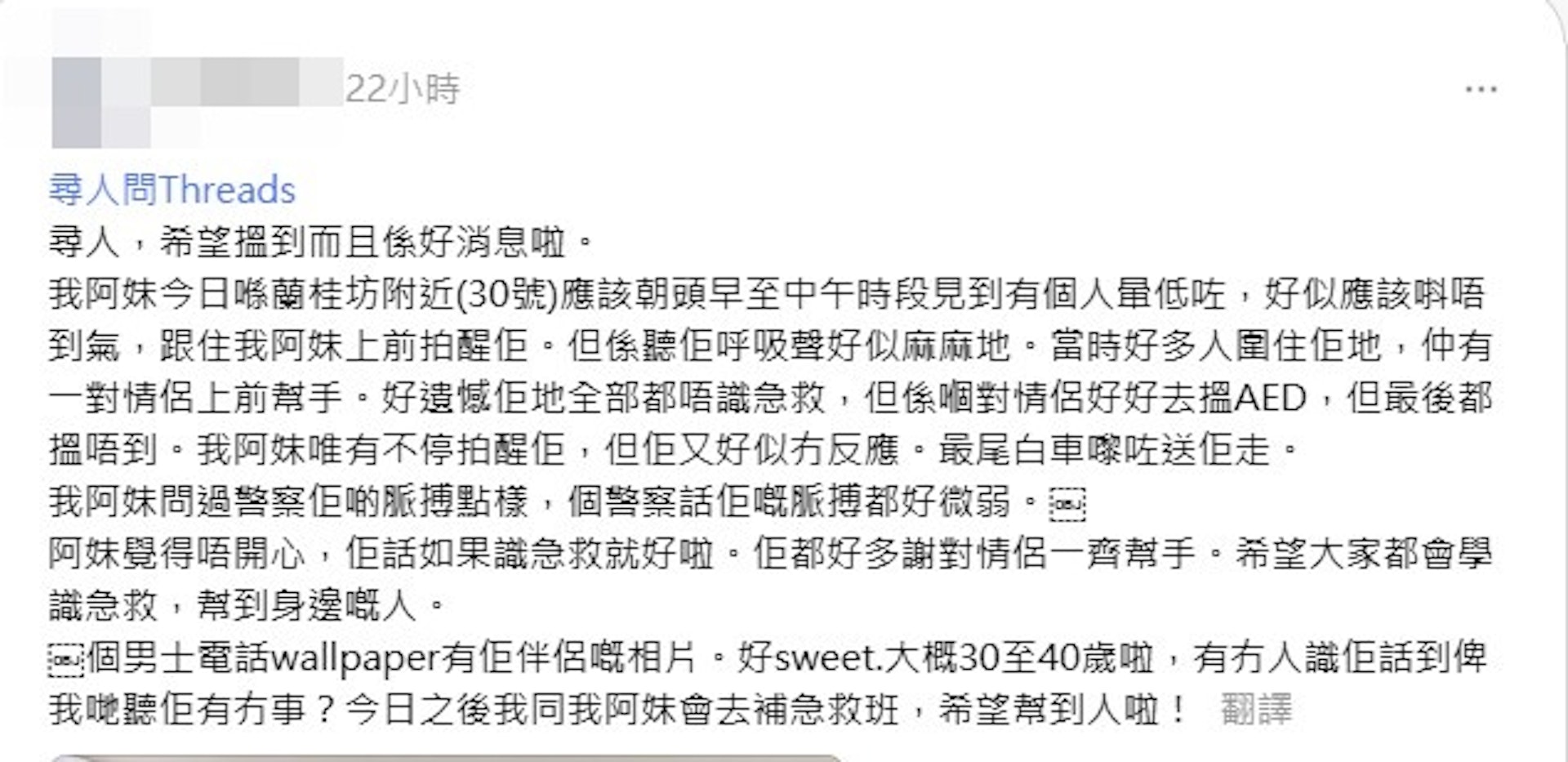 該名有份協助報案及施援的女途人,其家人今日(30日)凌晨在Threads「尋人」,希望暈倒男子大步檻過,「我妹妹確實都好驚,但當時無咩人上前幫手,冷靜完就上前幫佢。我妹妹想抬高佢對腳,但係有路人話唔好掂佢,所以佢唯一可以做就係不斷拍醒佢。」公仔箱論壇- R7 k% O# N6 `2 g5 T! t8 D