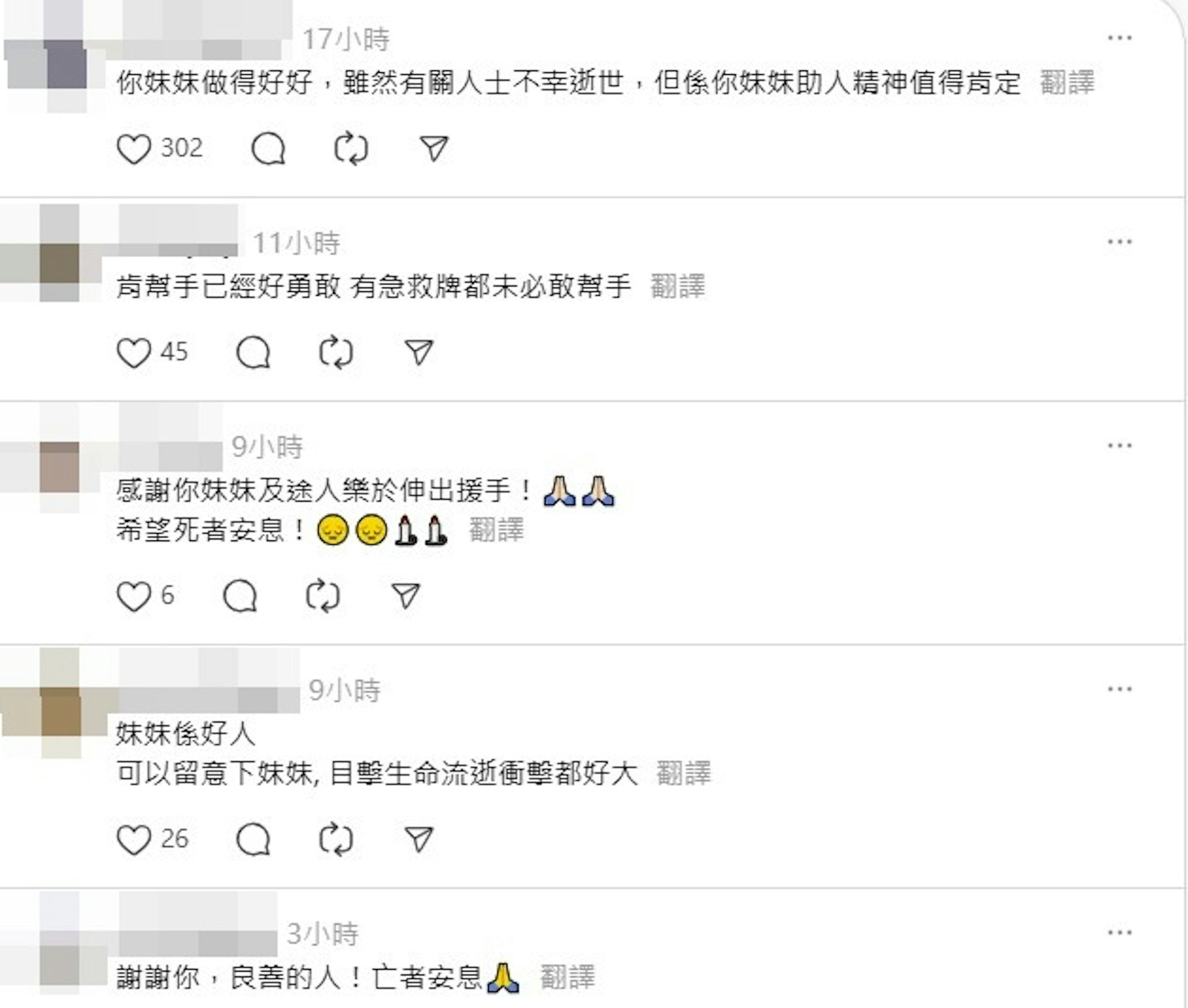 有關帖文引起網民一面倒留言大讚,「你阿妹好好,佢(死者)一定感受到」、「感謝你妹妹及途人樂於伸出援手!」、「肯幫手已經好勇敢,有急救牌都未必敢幫手」、「好人一生平安」。亦有人加以安慰,並提醒家人要多加留意,「可以留意下妹妹, 目擊生命流逝衝擊都好大。」tvb now,tvbnow,bttvb5 Q8 o7 B( w3 @7 {5 X