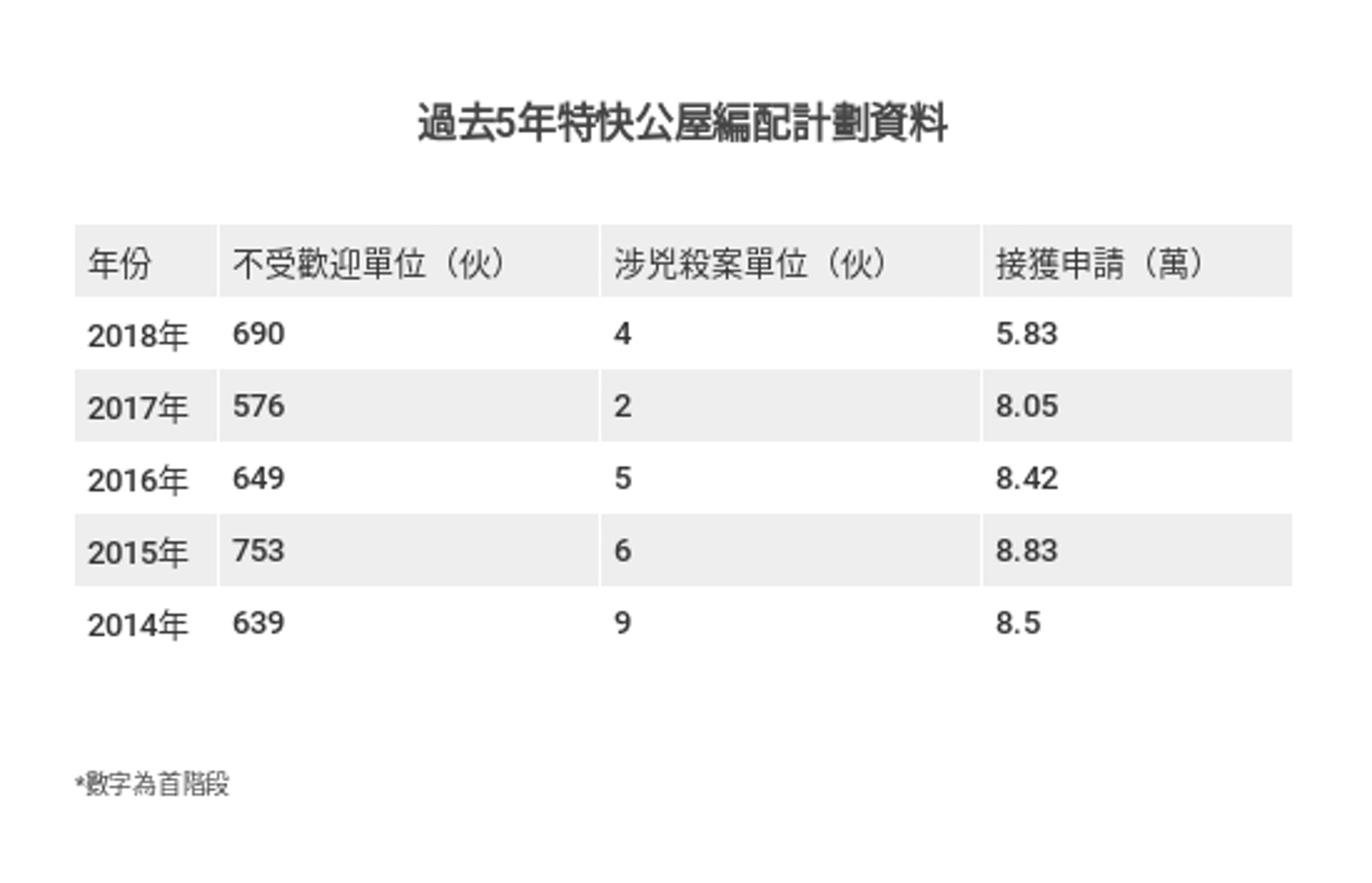 自2014年起,申請宗數一直突破8萬宗,2016及2017年分別收到8.42萬及8.05萬宗申請,而最新一期特快公屋編配計劃,房委會共接獲約5.83萬份申請,單身人士佔3.04萬份,二人或以上的家庭申請者則佔2.79萬份。署方指今期可供選擇的單位約有1300個,即超額約43.8倍,約44人爭1個單位。