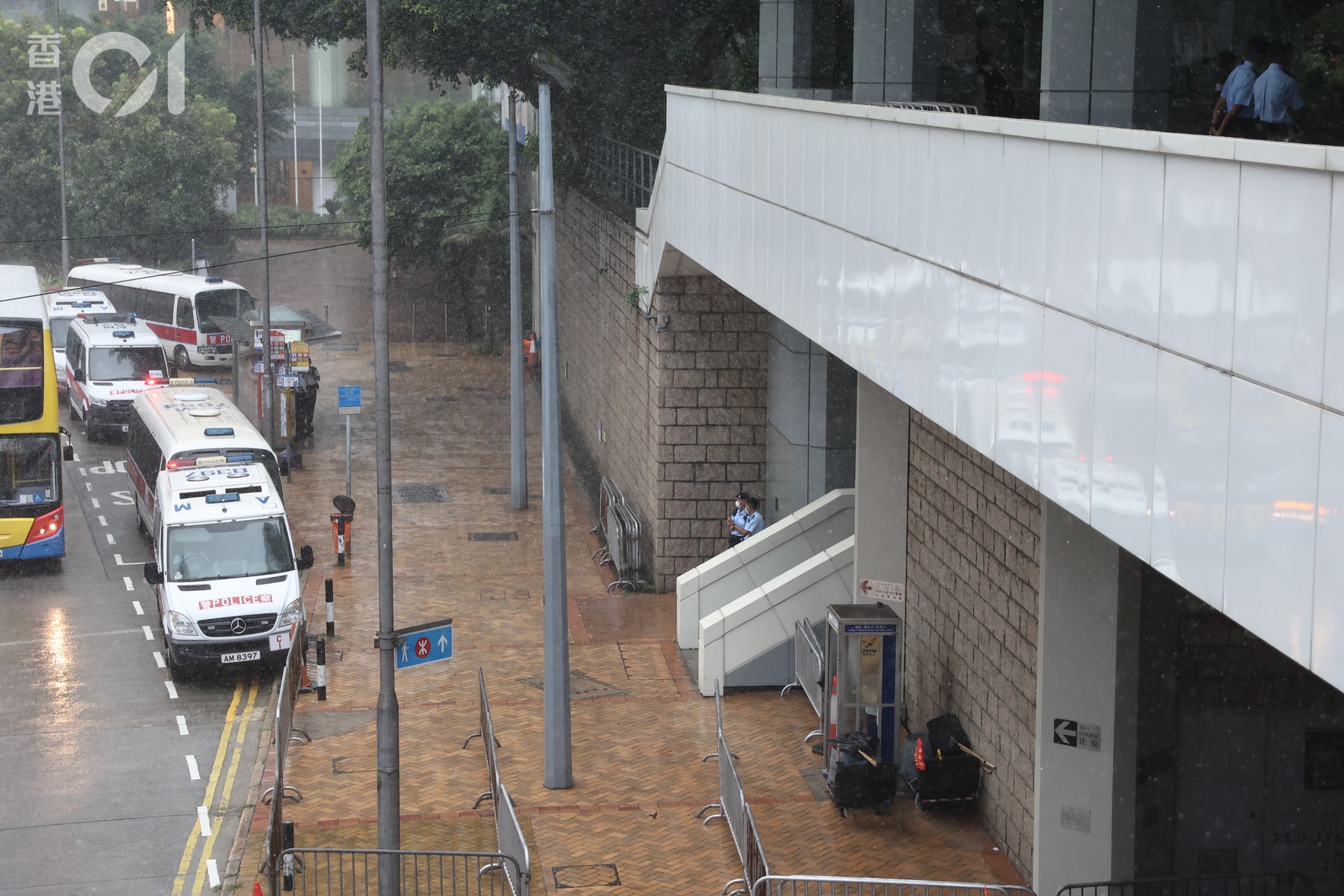 * n( r7 |! q% K4 r$ L4 Tos.tvboxnow.com高院囚車出口處有多架警車,亦有警員在附近注守。(盧翊銘攝)0 T% R+ C q" _