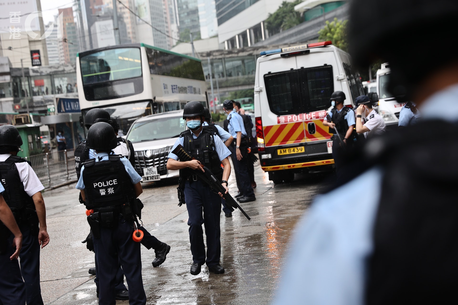 警方今日派出多名穿上避彈衣的警員在高院範圍戒備。(盧翊銘攝)