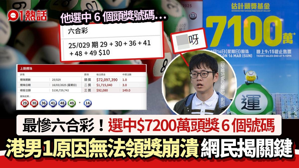 + \, ]8 Z0 f! N) k公仔箱論壇【六合彩/頭獎獎金】周日(3月16日)攪珠的六合彩頭獎獎金高達7,200萬元,有港男於開彩後在社交平台發布投注截圖,顯示他選中了頭獎攪出的6個號碼,卻因1個原因無法領取獎金,慘呼:「X呀!」