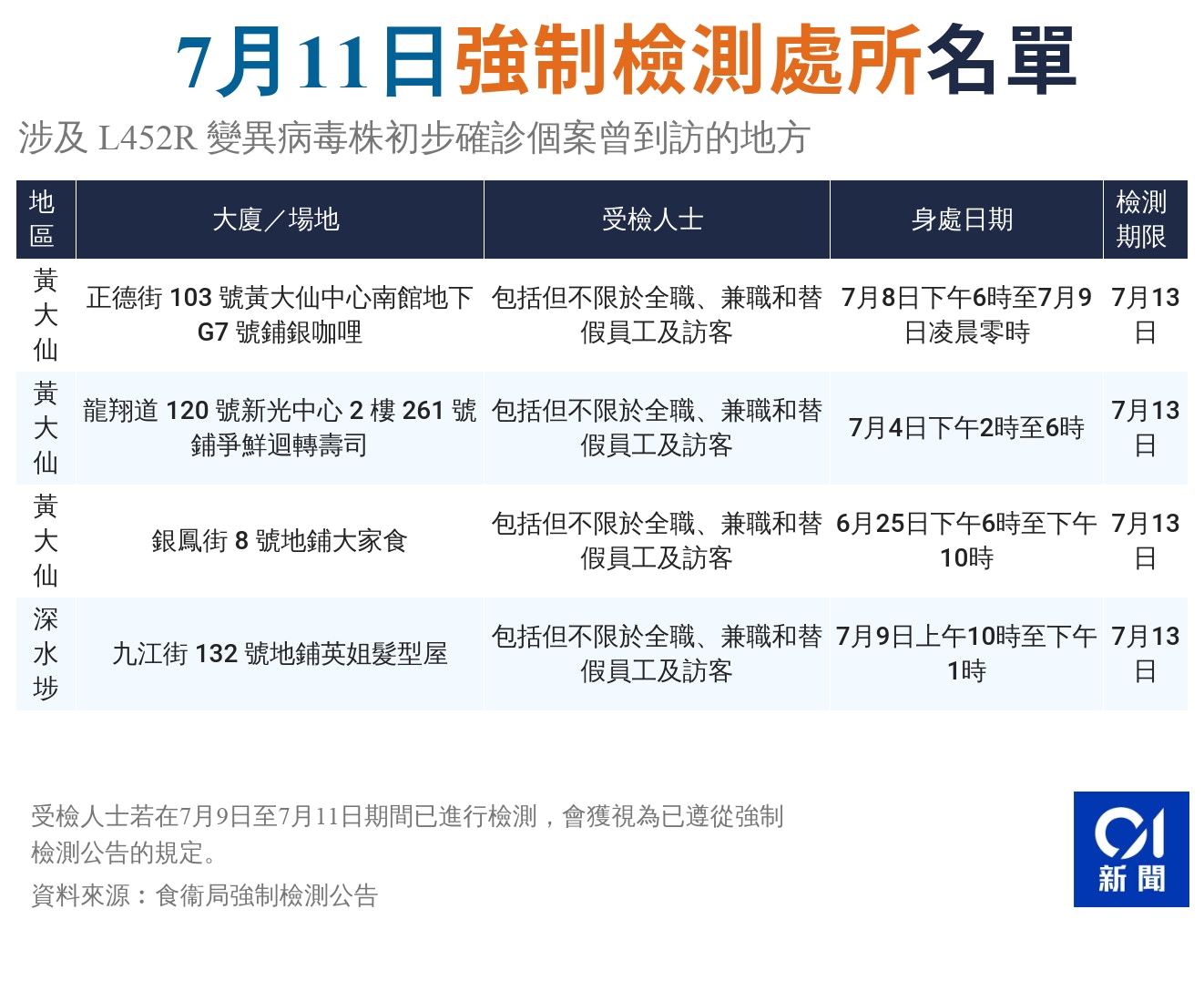 另外,在衞生防護中心的進一步調查下,早前一宗曾於香港居住、涉及L452R變異病毒株的非本地確診個案,曾身處一個指明地方,該處同樣列入強制檢測通告。6月17日下午6時至10時曾到尖沙咀中心「Wooloomooloo Steakhouse」的人士,需於7月13日前,完成檢測。