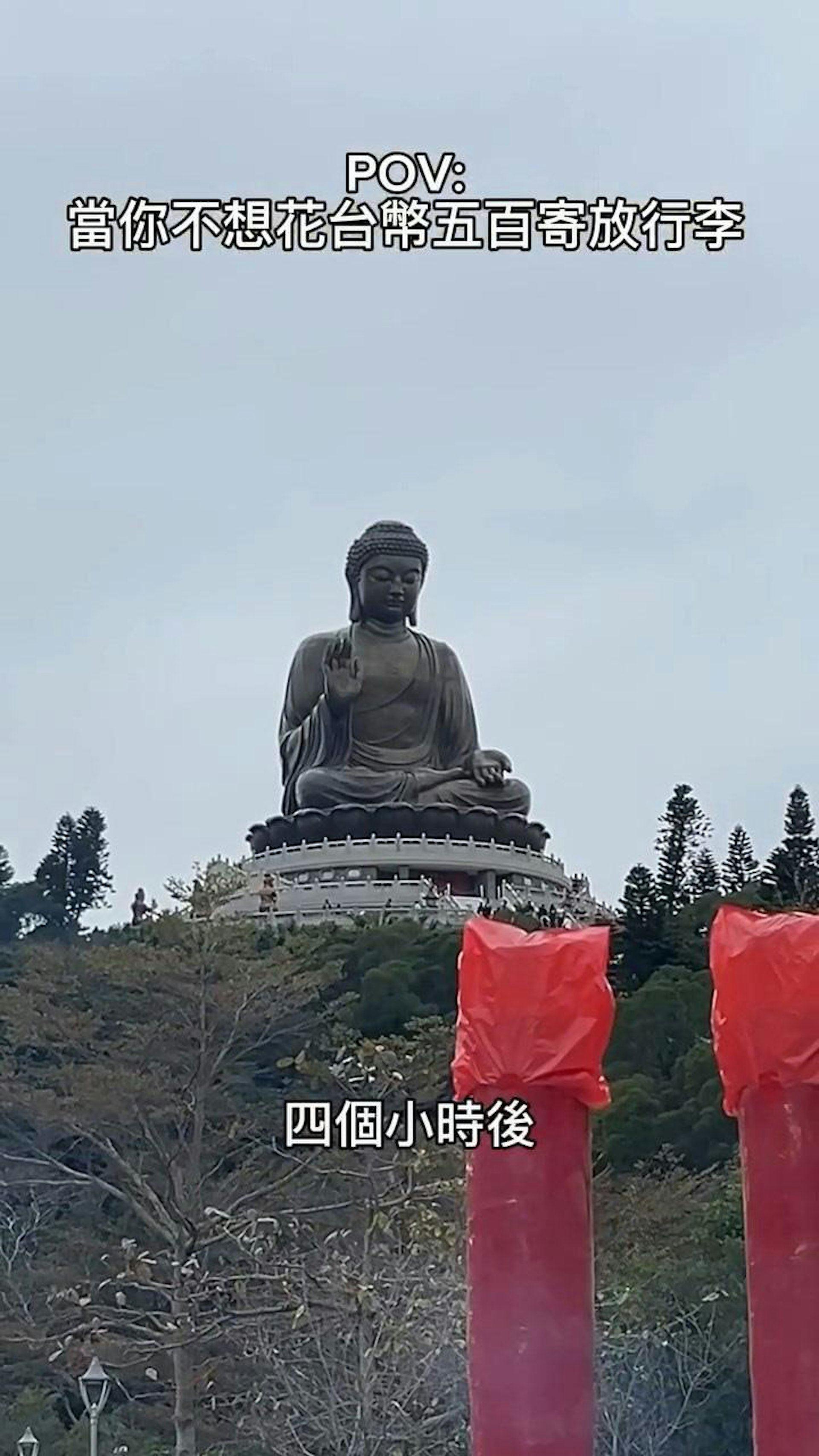 有台灣女生到大嶼山天壇大佛旅遊時,因想節省100港元寄放行李費用,於是把行李篋藏在附近草叢。(threads影片)