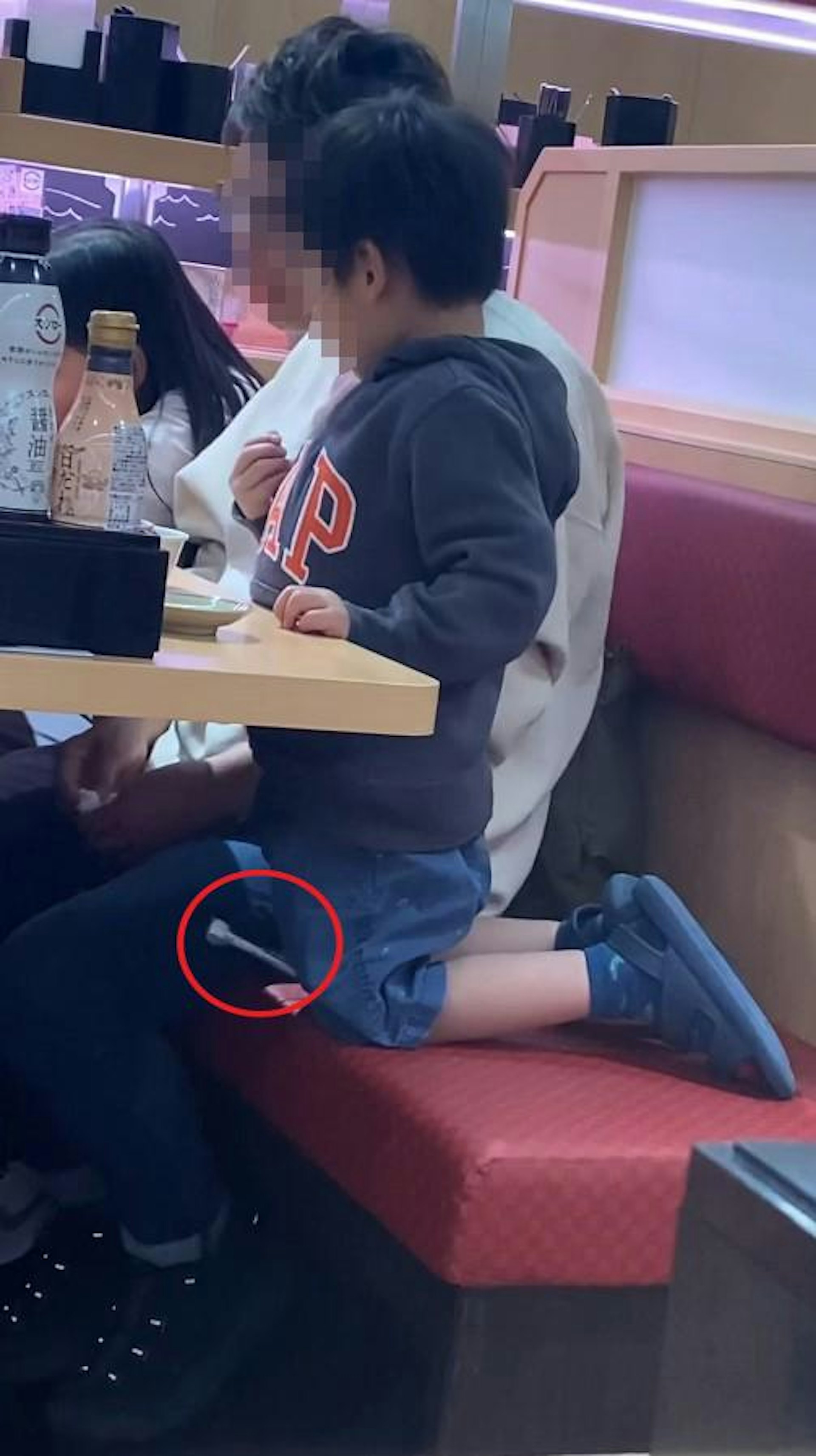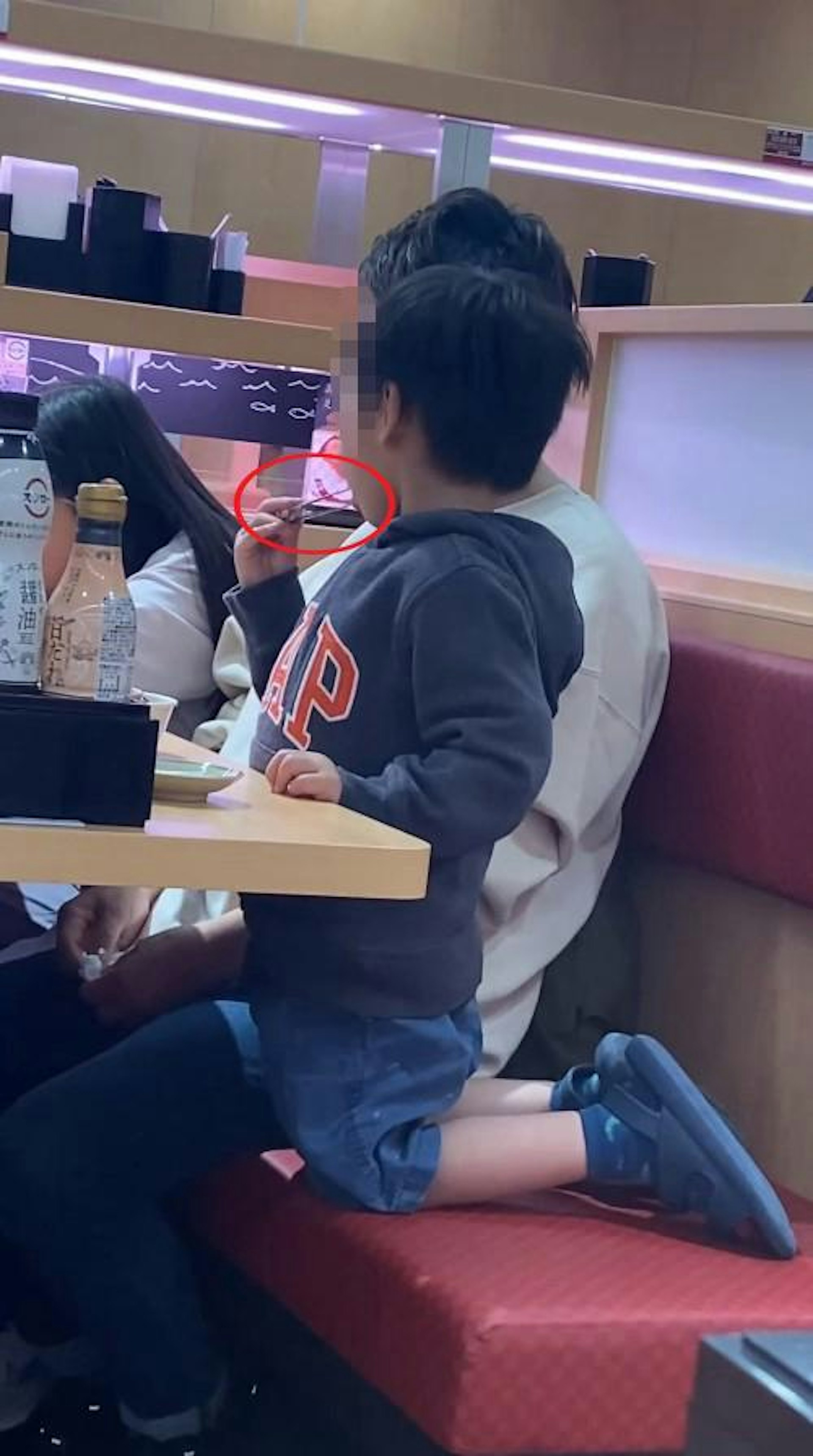 有食客日前於沙田新城市廣場的壽司郎分店用餐時,赫然發現鄰座有男童穿着涼鞋跪坐在椅上,右手拿着公用薑片夾放在口中舔舐。(Threads影片截圖)