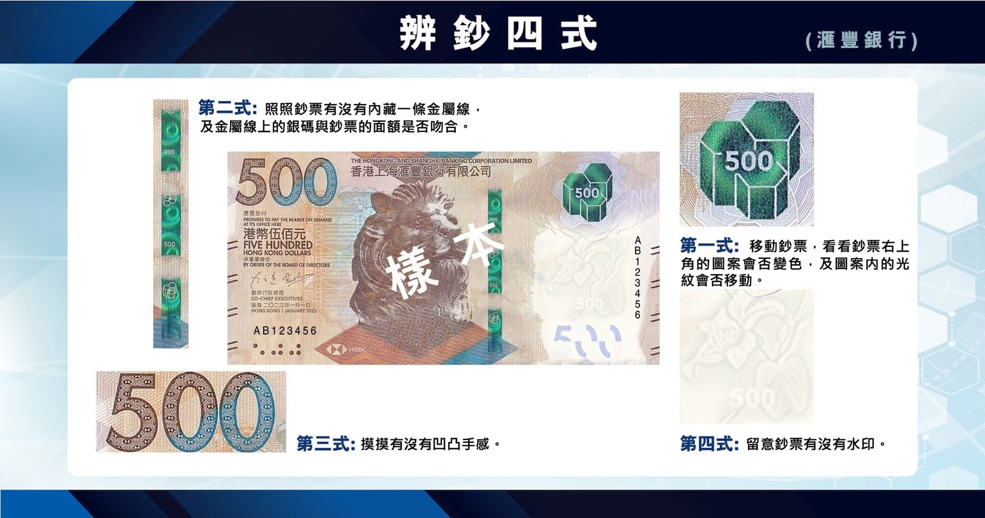 過去本港多次出現500元偽鈔,警方形容相關偽鈔質素差劣,是以一般噴墨打印機印製,市民只需一至兩秒可憑肉眼及手感分辨真偽,並教市民「辨鈔四式」以分辨鈔票真偽: