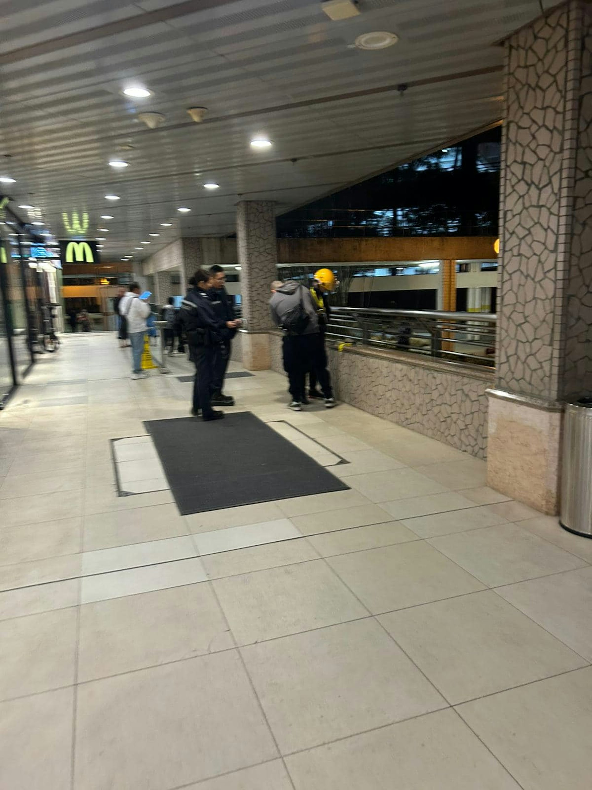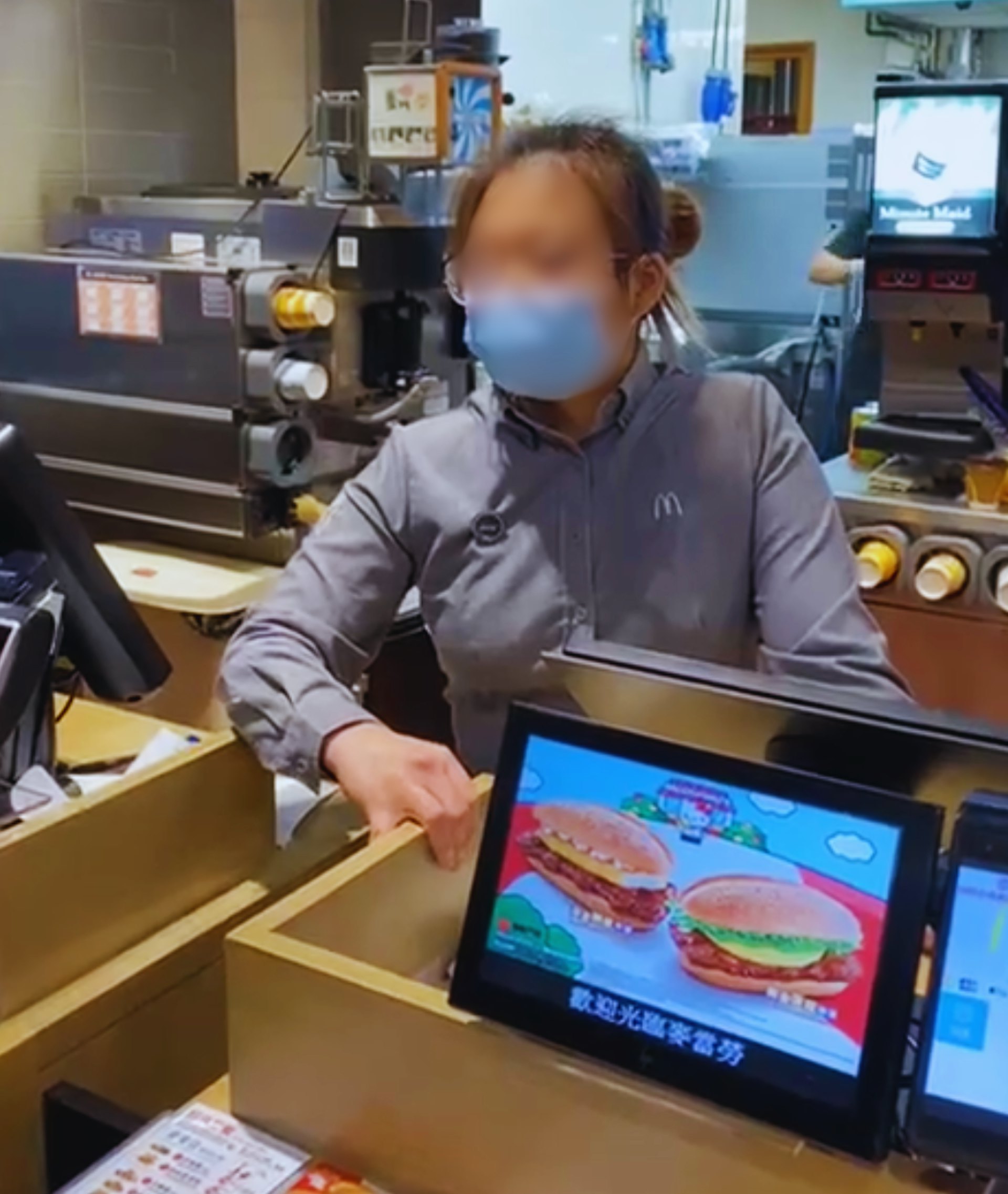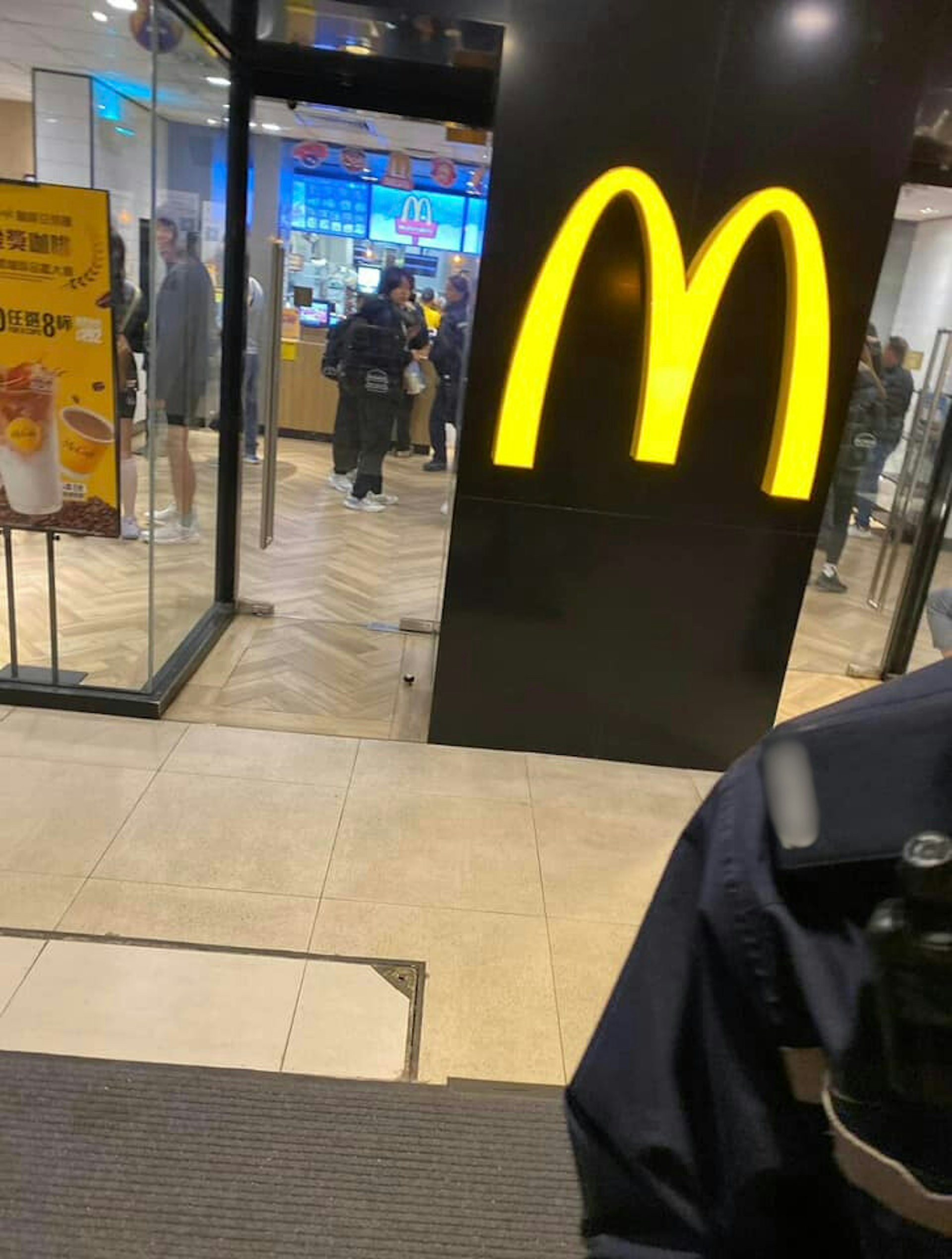網上流傳事發時的影片,一名麥當勞職員手持電話疑正在報案,另一職員一臉無奈。(KeeTa外賣關注組 Facebook / Chan Wai Ko) E+ p9 y& j( J0 x
