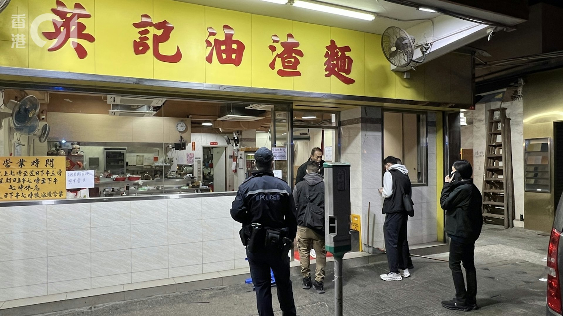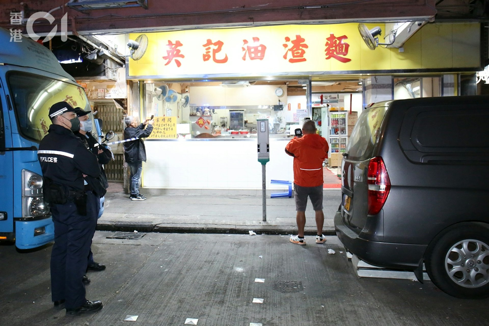 案發現場為大角咀英記油渣麵。事發後店內相當凌亂,血花四濺。店內設有閉路電視,警員正調查事發組過。(李家傑攝)