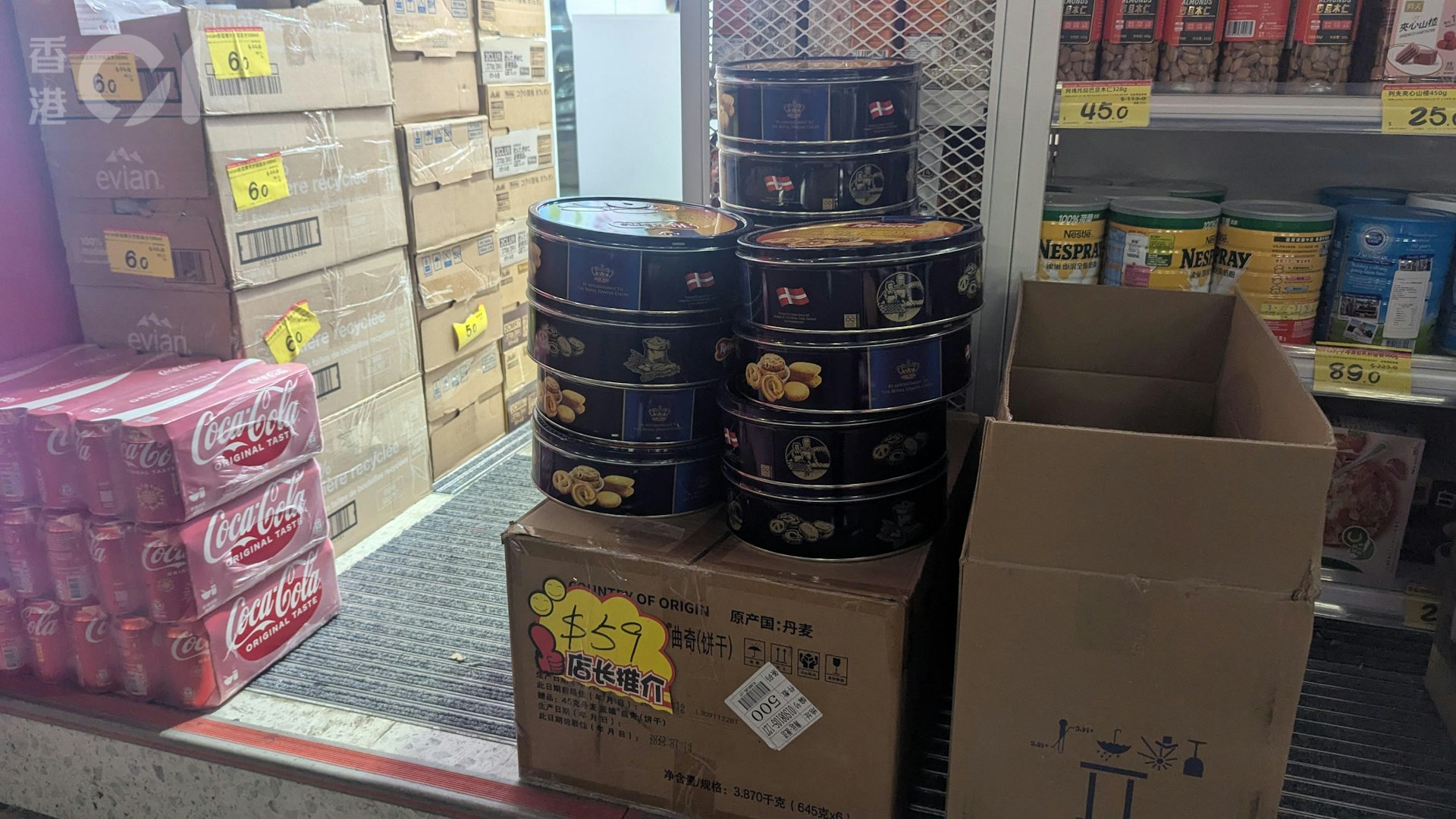 內地攻港超市「HotMaxx好特賣」葵芳分店以59元出售600克裝「丹麥藍罐曲奇」。(譚曉彤攝)