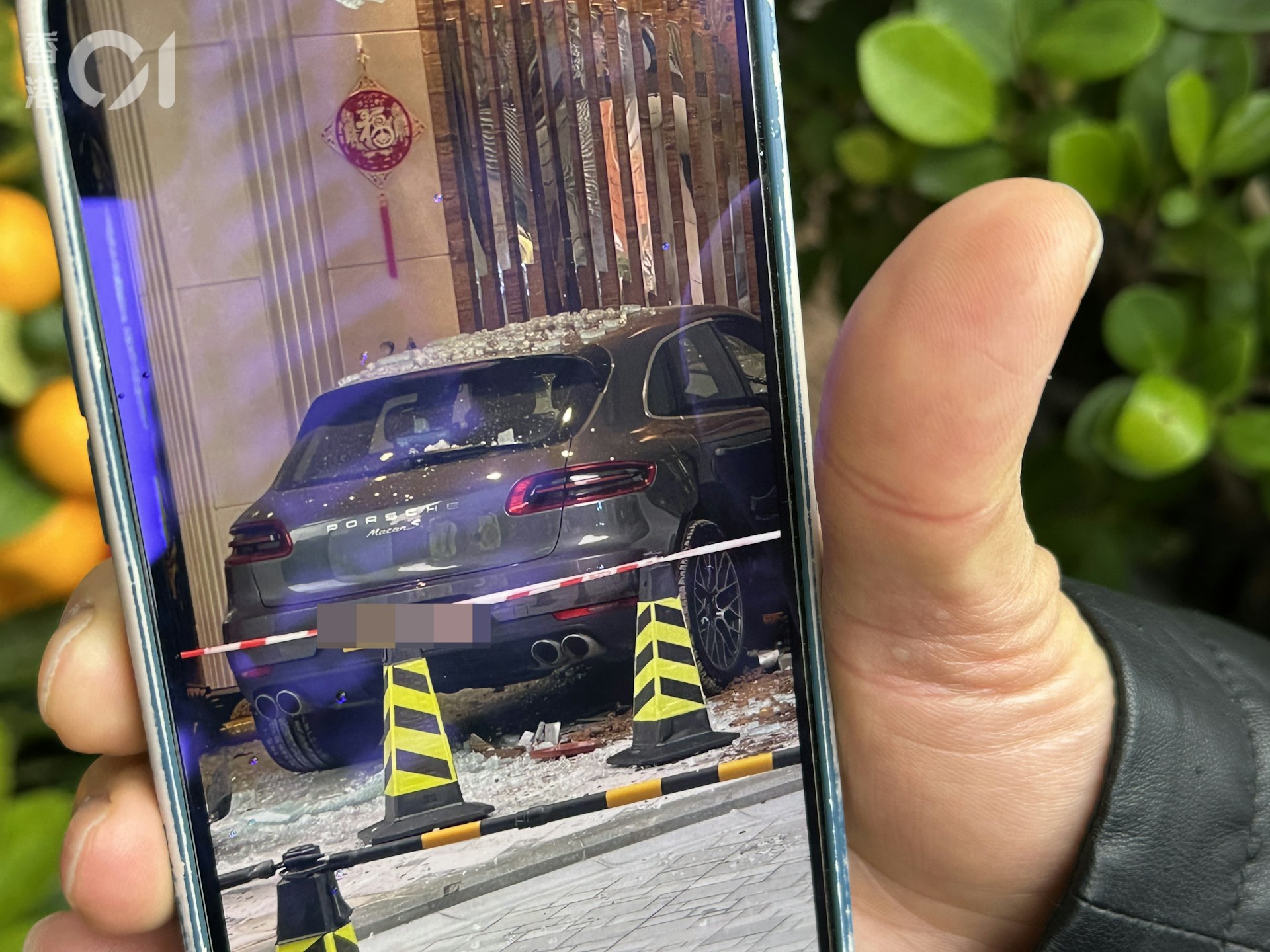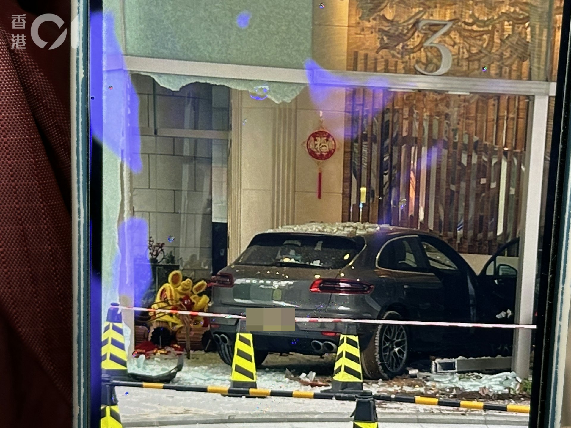 ) W6 n) B) ]& X) f8 a( |tvb now,tvbnow,bttvb現場可見,保時捷撞入3座大堂,大堂落地玻璃碎裂剝落。(讀者提供)