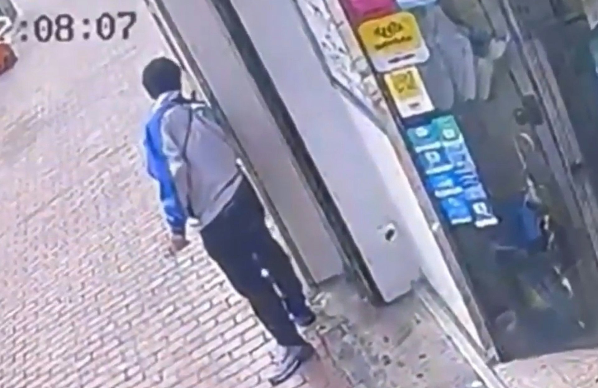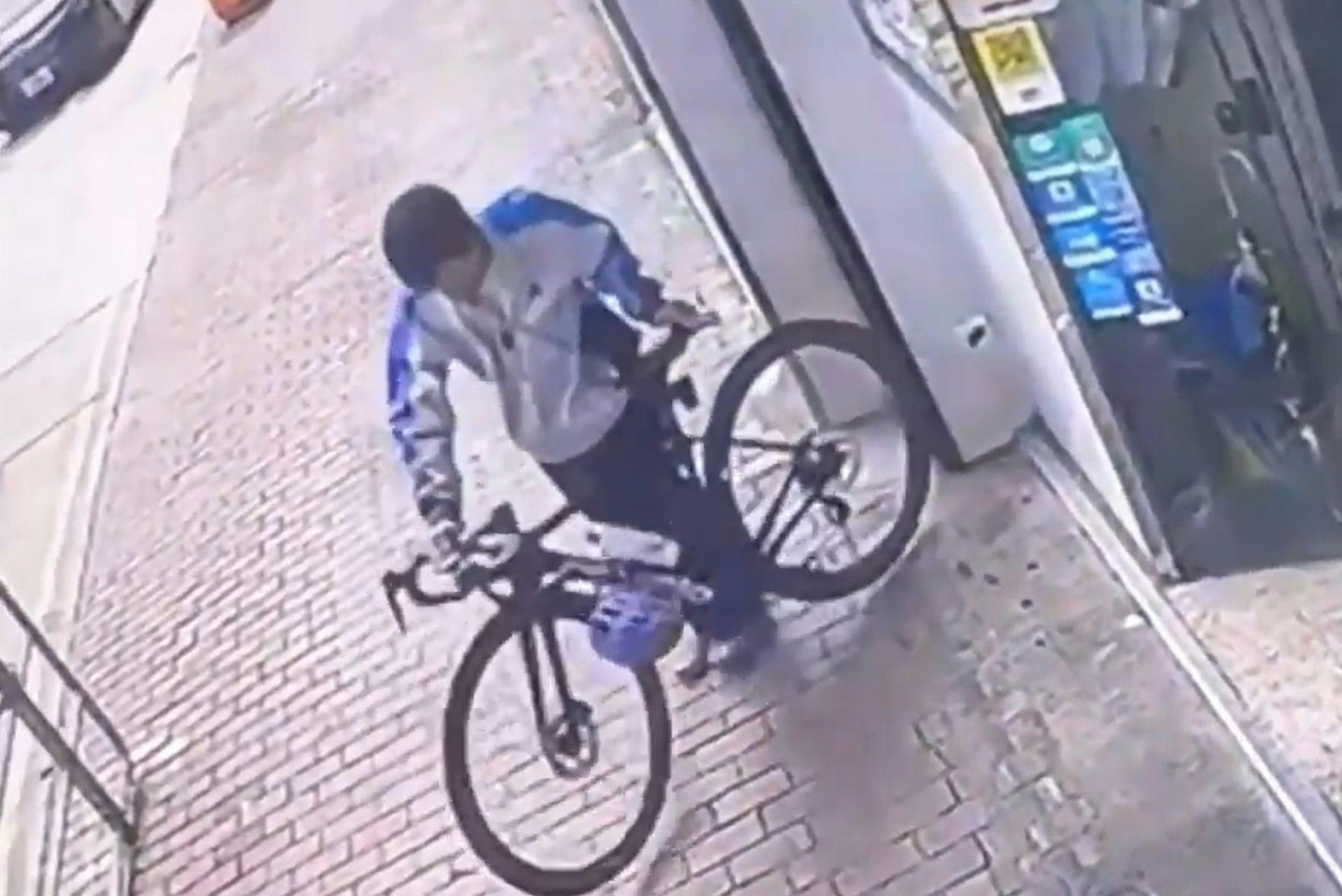 * v+ C4 z) E" s( G" I0 u& w網上同日流傳相關閉路電視片段,一名身穿藍白色運動外套的男子在街上吃着小食,之後背對鏡頭,繼而連同頭盔,一併抬走單車。