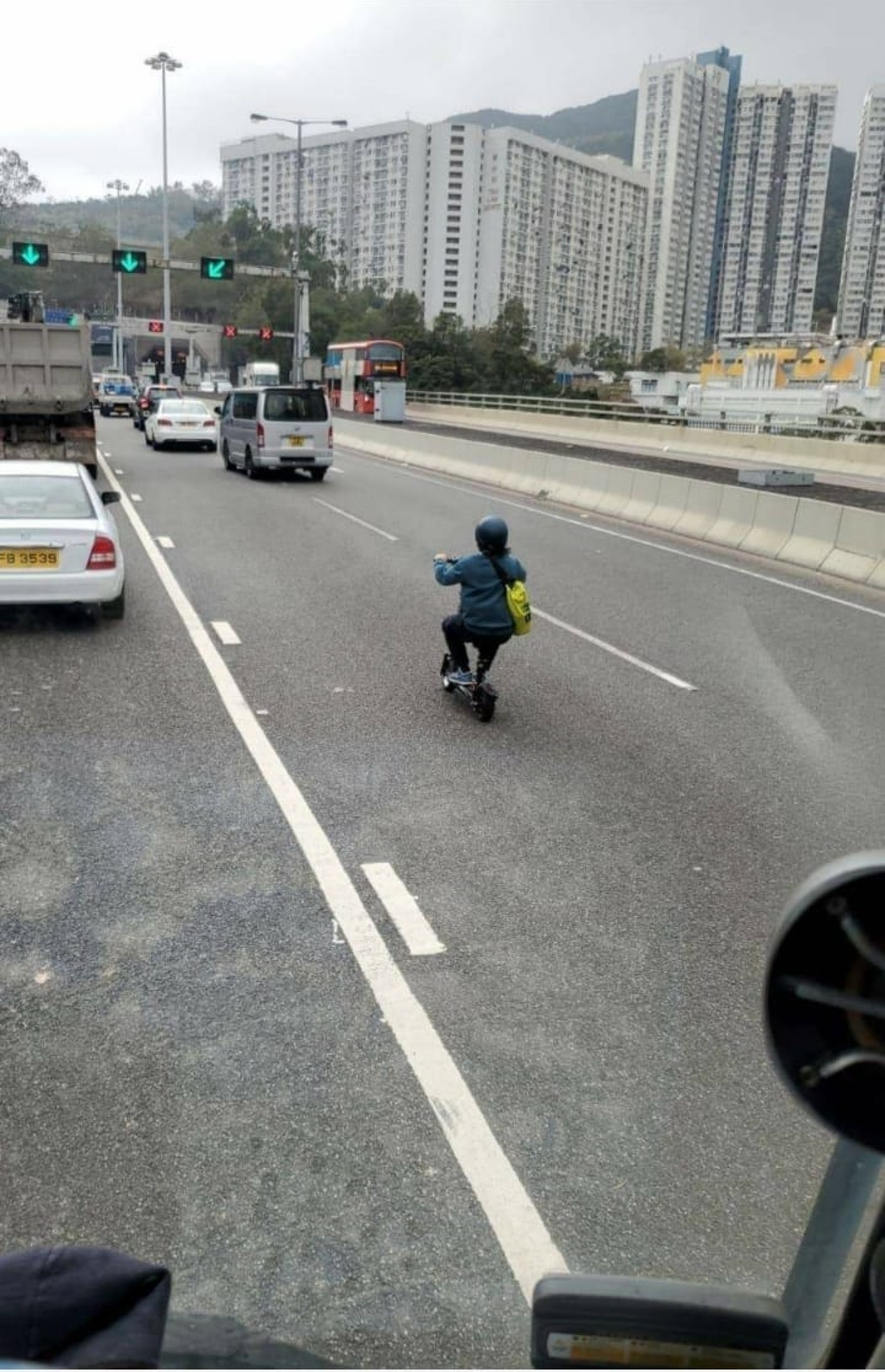 今(8日)網上流傳多張照片,一名男子懷疑駕駛電動滑板車沿將軍澳隧道公路行駛,被多名駕駛者拍下過程,更有照片拍到電動滑板車進入隧道內行駛,引來大批網民熱議。不少人均質疑電動滑板車男如何支付隧道費,亦有人驚呼行為離譜﹑十分危險。