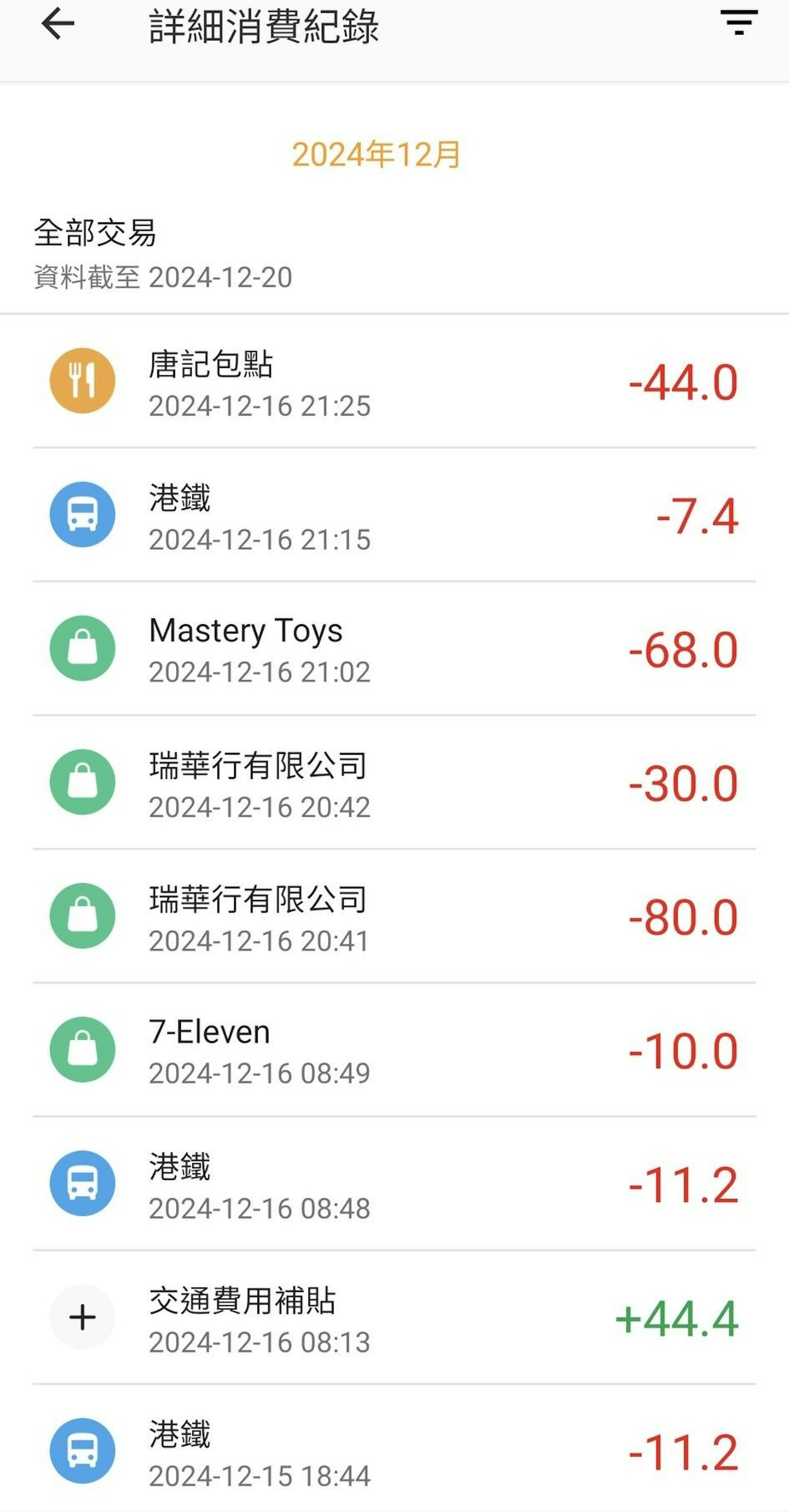 從其八達通APP的交易紀錄所見,當日晚上8時41分在瑞華行消費80元,1分鐘後再消費30元,9時2分在Mastery Toy消費68元,之後乘港鐵車資為7.4元,9時25分再於唐記包點消費44元,44分鐘內花了229.4元。