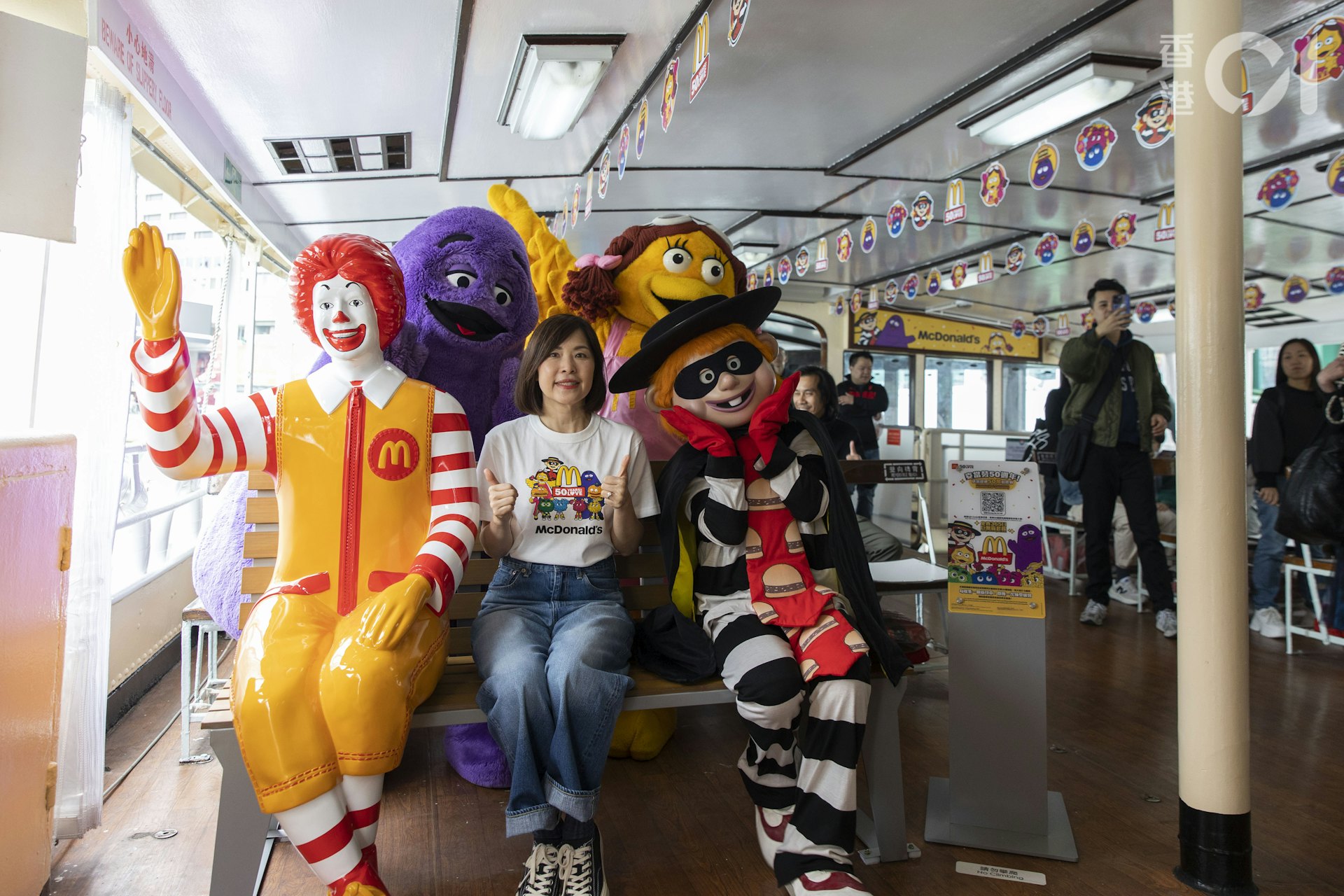 主題船的上層除了貼滿各種麥當勞海報,還有以維港作背景的經典麥當勞叔叔長凳,三大吉祥物——小飛飛、滑嘟嘟和漢堡神偷亦有隨行登船,向船上的乘客打招呼,粉絲亦忙着不停拍照,尤其麥當勞叔叔長凳,深受粉絲歡迎,有多人排隊輪候打卡。* J& B& a# R) h4 S