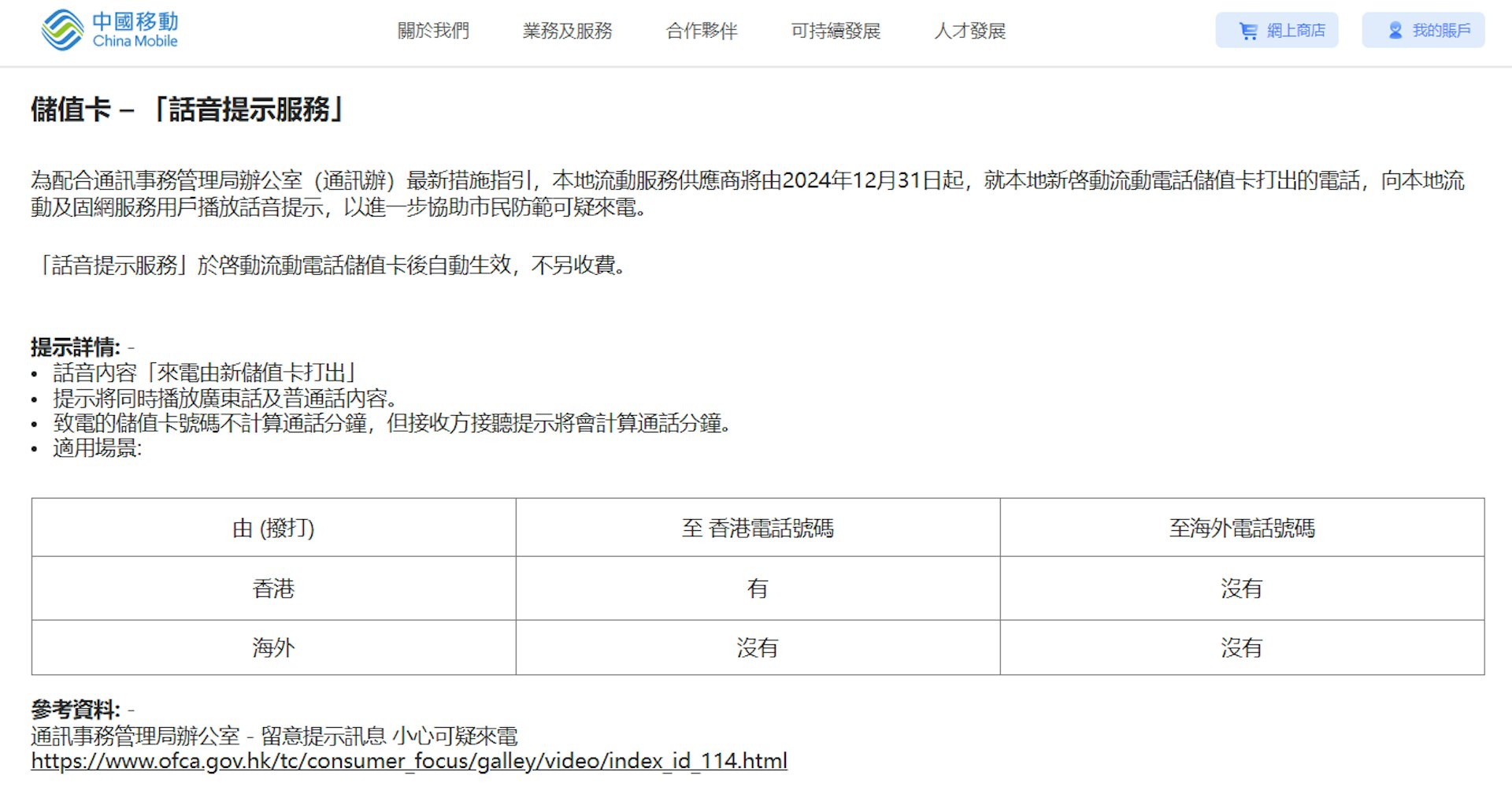 詐騙手法層出不窮,為協助市民防範可疑來電,通訊辦規定由2024年12月31日起,所有新啟動的本地流動電話儲值卡,流動服務供應商必須為其撥出的來電,先播放「來電由新儲值卡打出」的語音提示,待提示結束後來電方可接通,以提醒市民提高警覺。市民毋須預先登記、設置或安裝任何APP,便可免費使用該提示服務。7 l+ l& ~( y1 d% p3 `6 I7 y