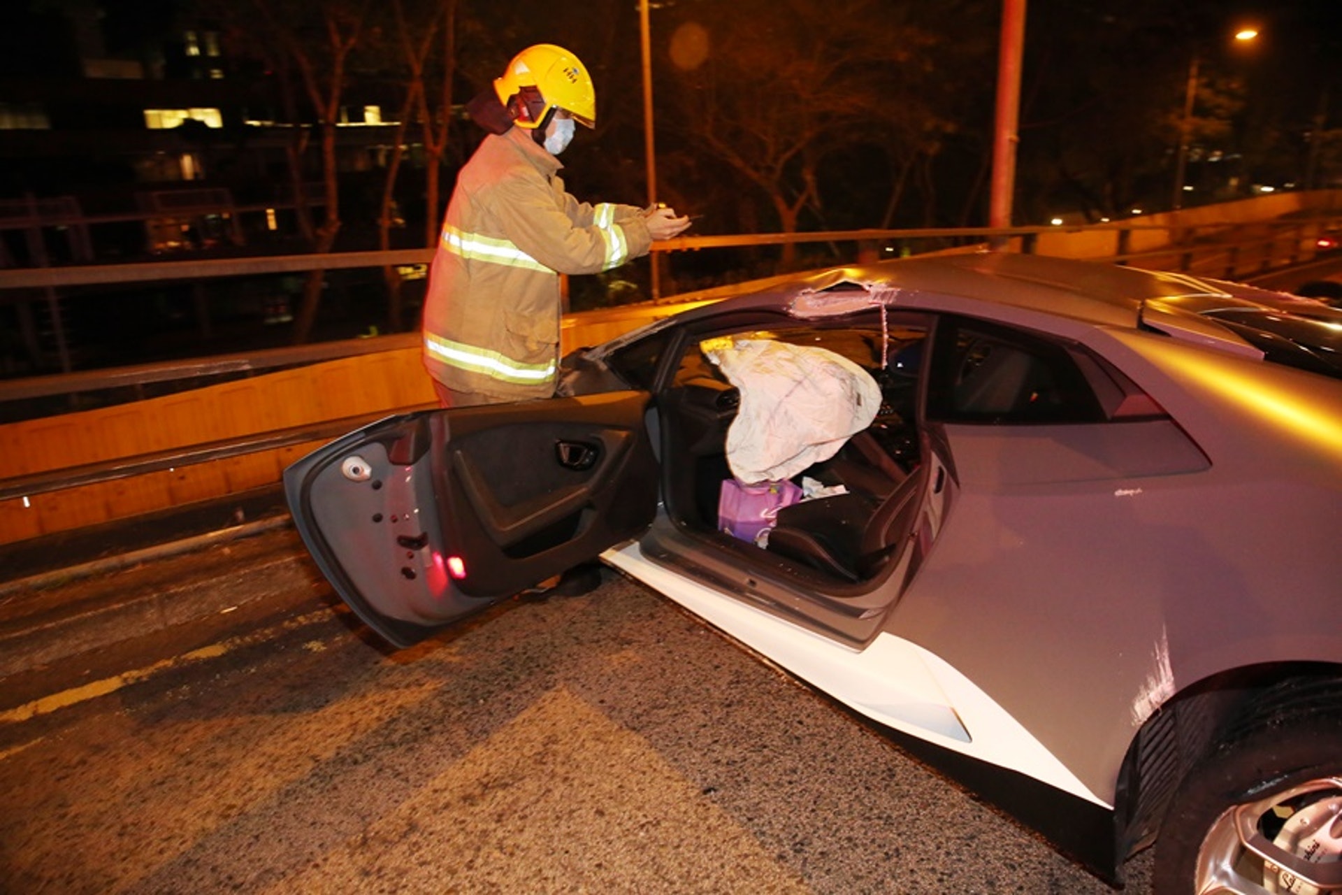 涉事林寶堅尼車身嚴重損毀,氣袋彈出,車輪飛脫,司機不知去向。救援人員正檢查車輛。(陳永武攝)