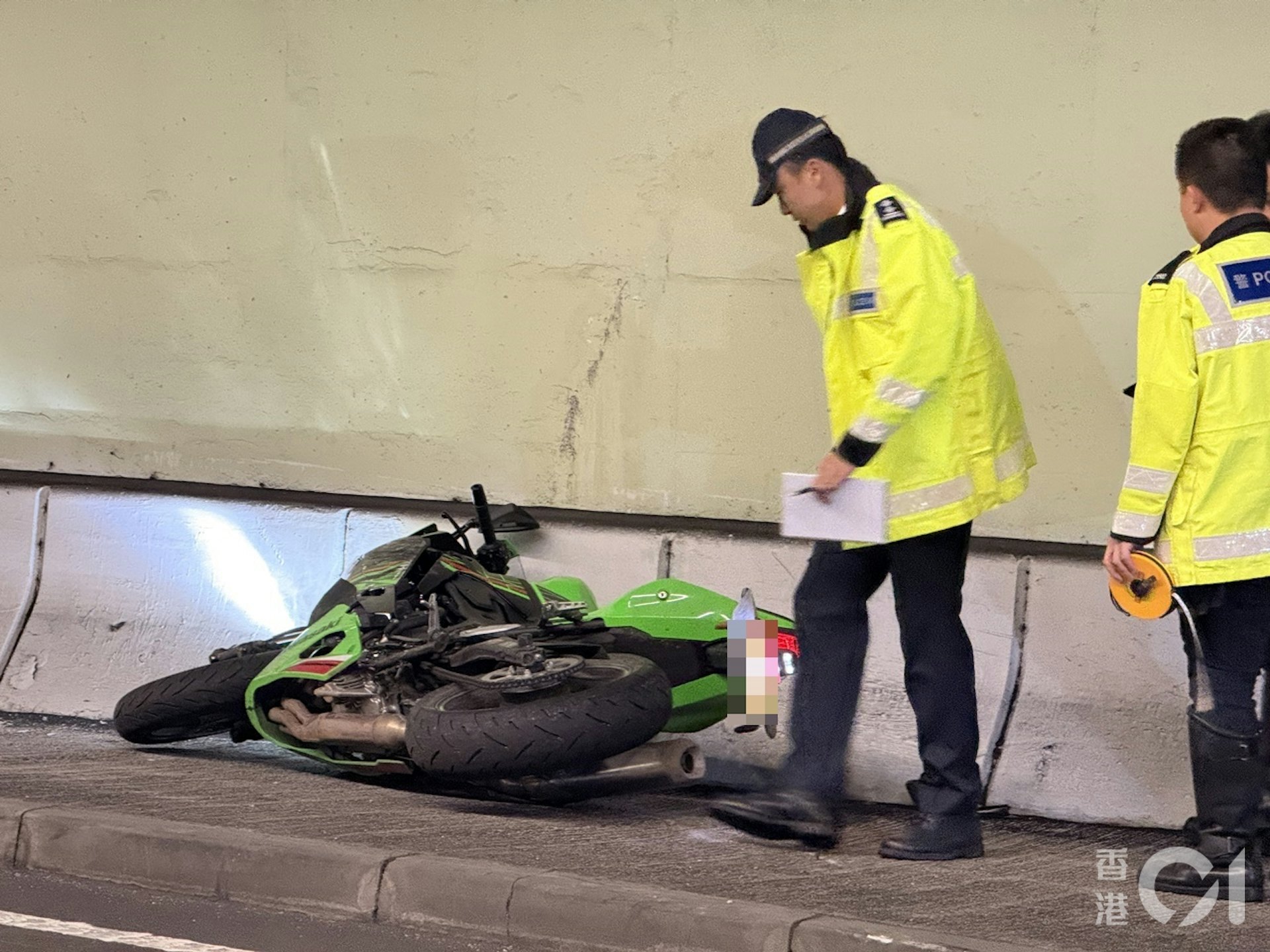 , D n7 n. K9 F5 ]6 d# b0 r3 ~3 f# T* Z公仔箱論壇涉事電單車在連翔道地下行車道(即柯士甸道西隧隧道)失事。(羅日昇攝)