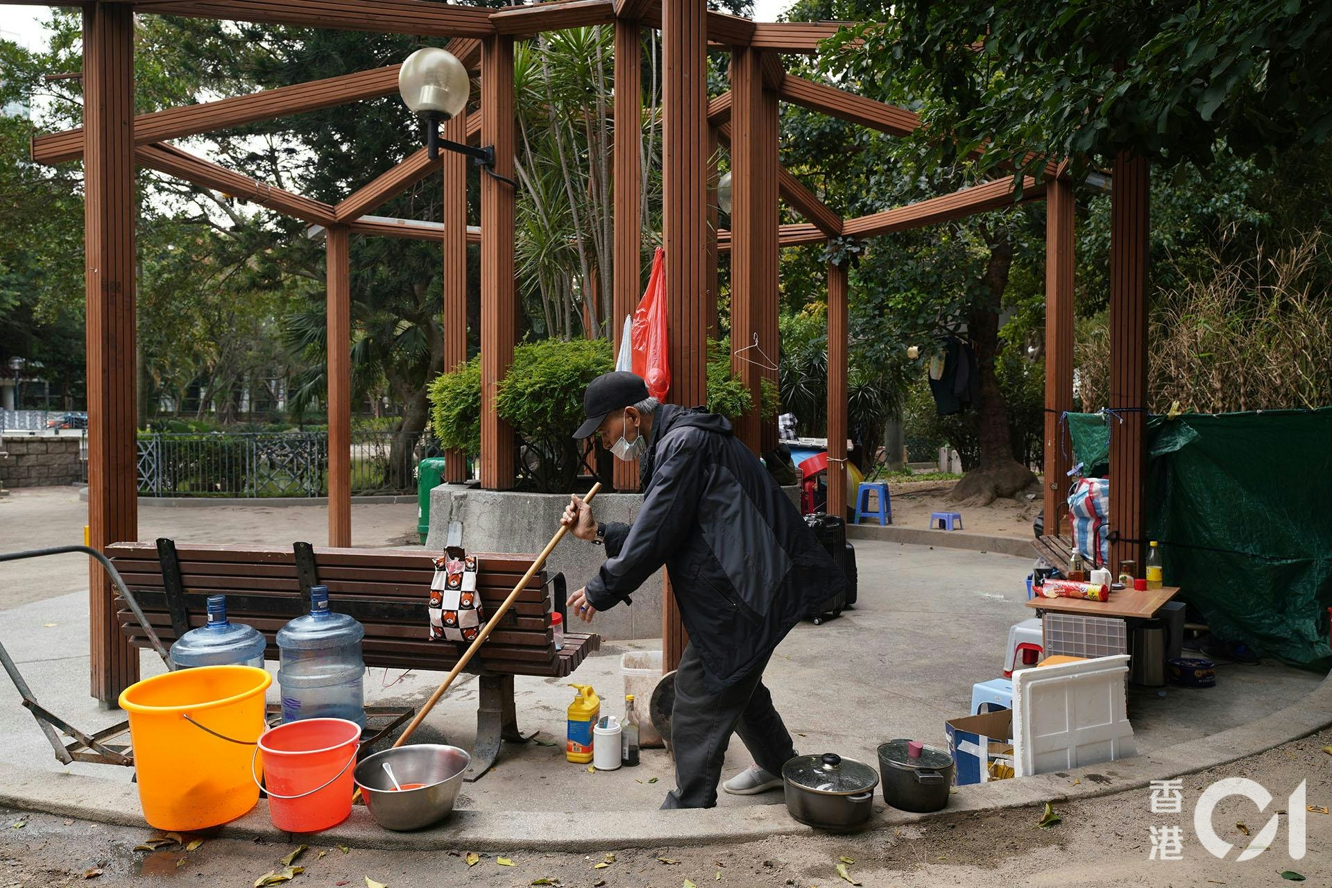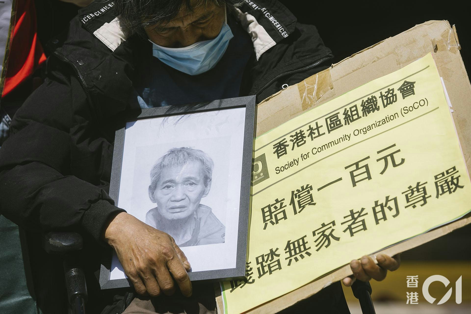 # r( `: S* f4 u/ g. E! q: K& ?+ ?2 M7 L6 w2019年冬至,康文署與防暴警在深水埗通州街公園清場,丟棄露宿者的家當。無家者入稟告政府,法庭在2022年3月29日裁定無家者勝訴,每人只獲得象徵式賠償100元。判決當日,兩名入稟者已經去世,露宿者在康文署請願。(資料圖片 / 鄭子峰攝)100元的「尊嚴」