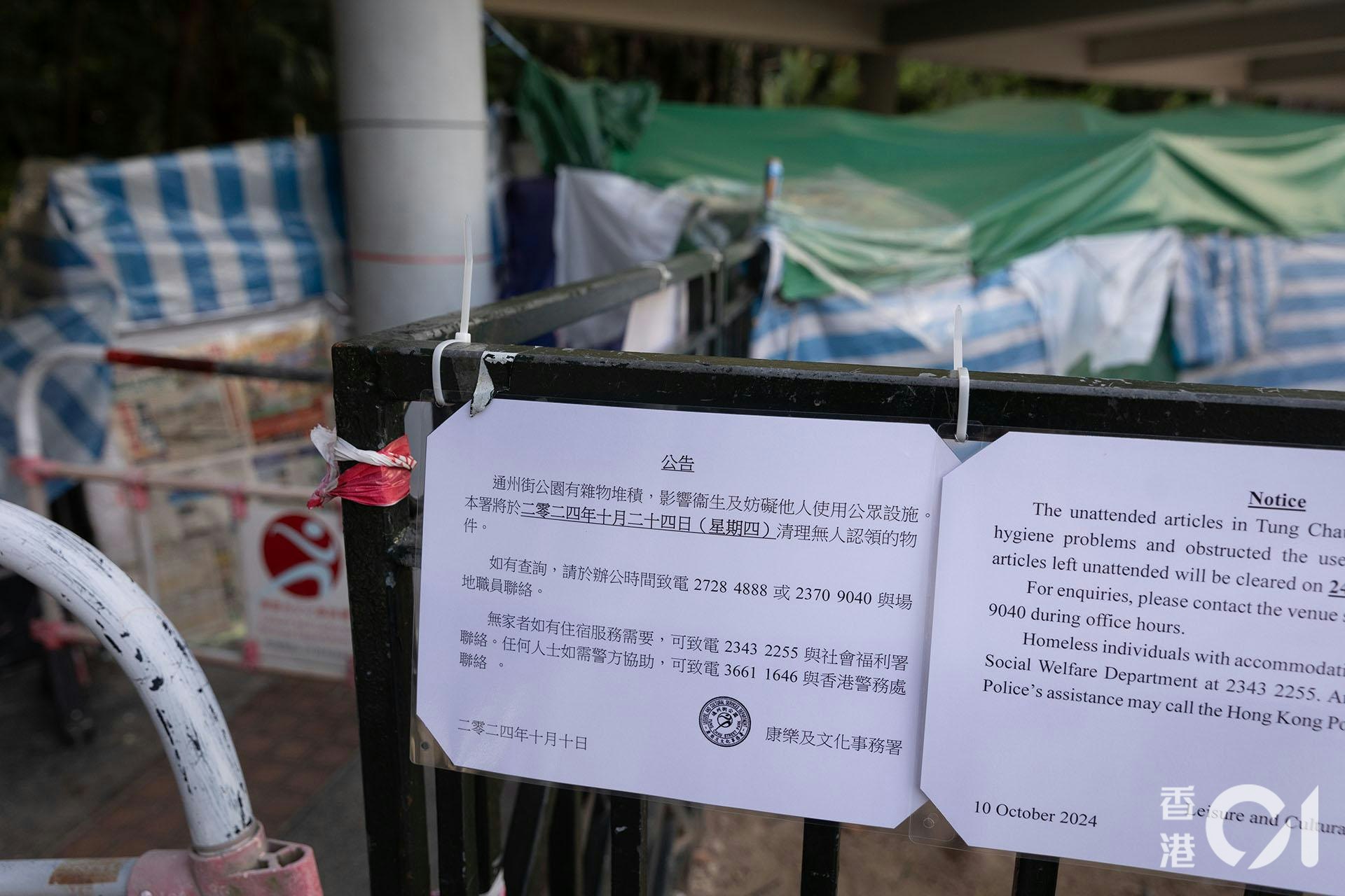 8 q; I1 d' X# a) [! i$ \tvb now,tvbnow,bttvb深水埗通州街公園,康文署清潔前會用不同語文貼出告示,讓露宿者有時間收拾家當。(廖雁雄攝)