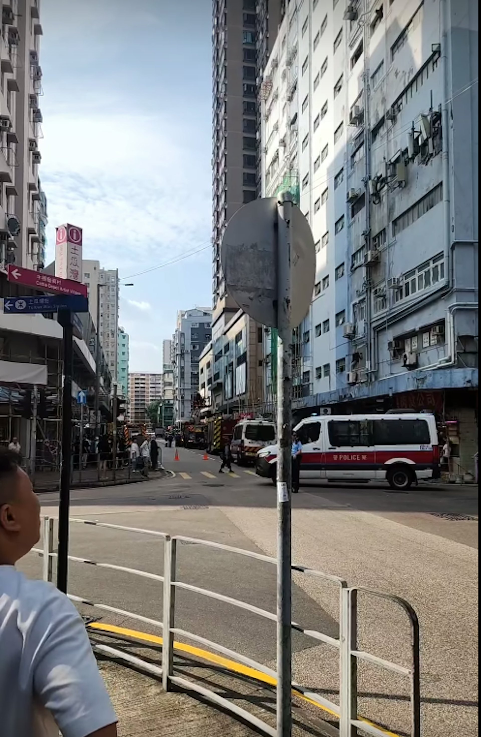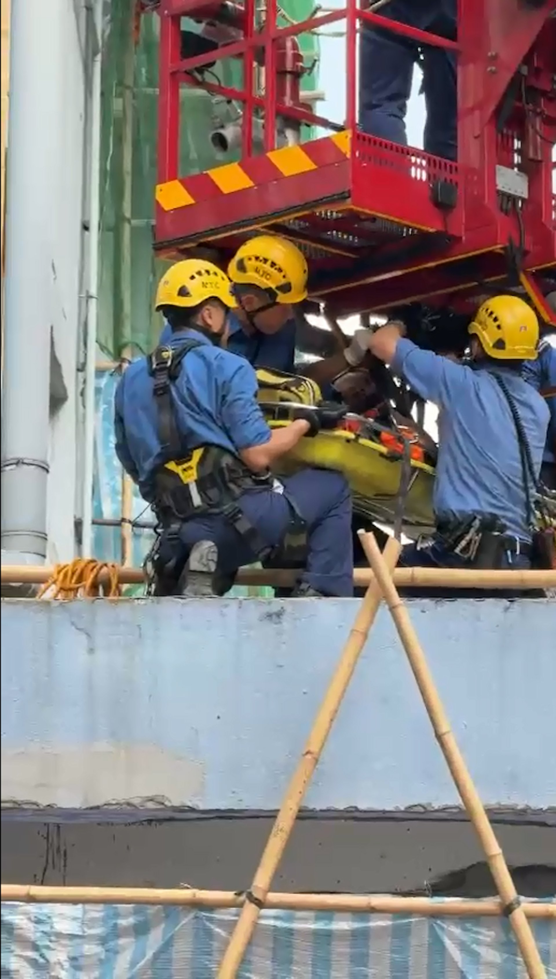 事發地點附近舖頭街坊陳先生目擊經過,見到事主在接近棚架頂頭部位置,連人帶兩支竹及狗臂架墮至大廈石屎簷篷,頭部著地,立即報警。警方及消防在1分鐘後已趕至現場,消防升起雲梯登上簷篷救人,事主頭部浴血、手部骨折,獲救回地面時已陷昏迷,救護員隨即以心外壓機施救,並將他送院,整個救援過程歷時約10分鐘。現場有其他工人在不同位置工作,事後協助警方調查。陳表示「個狗臂架都跌埋」,稱事主獲救時不見有救生繩。