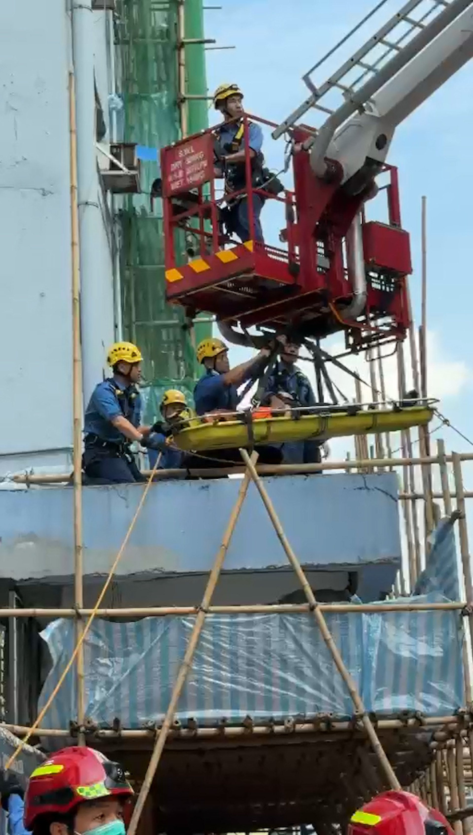 * s2 s! P% i, ~' l, G2 o$ z消防員到場將載有傷者的擔架扣在雲梯上,將傷者移落地面。(讀者提供) |