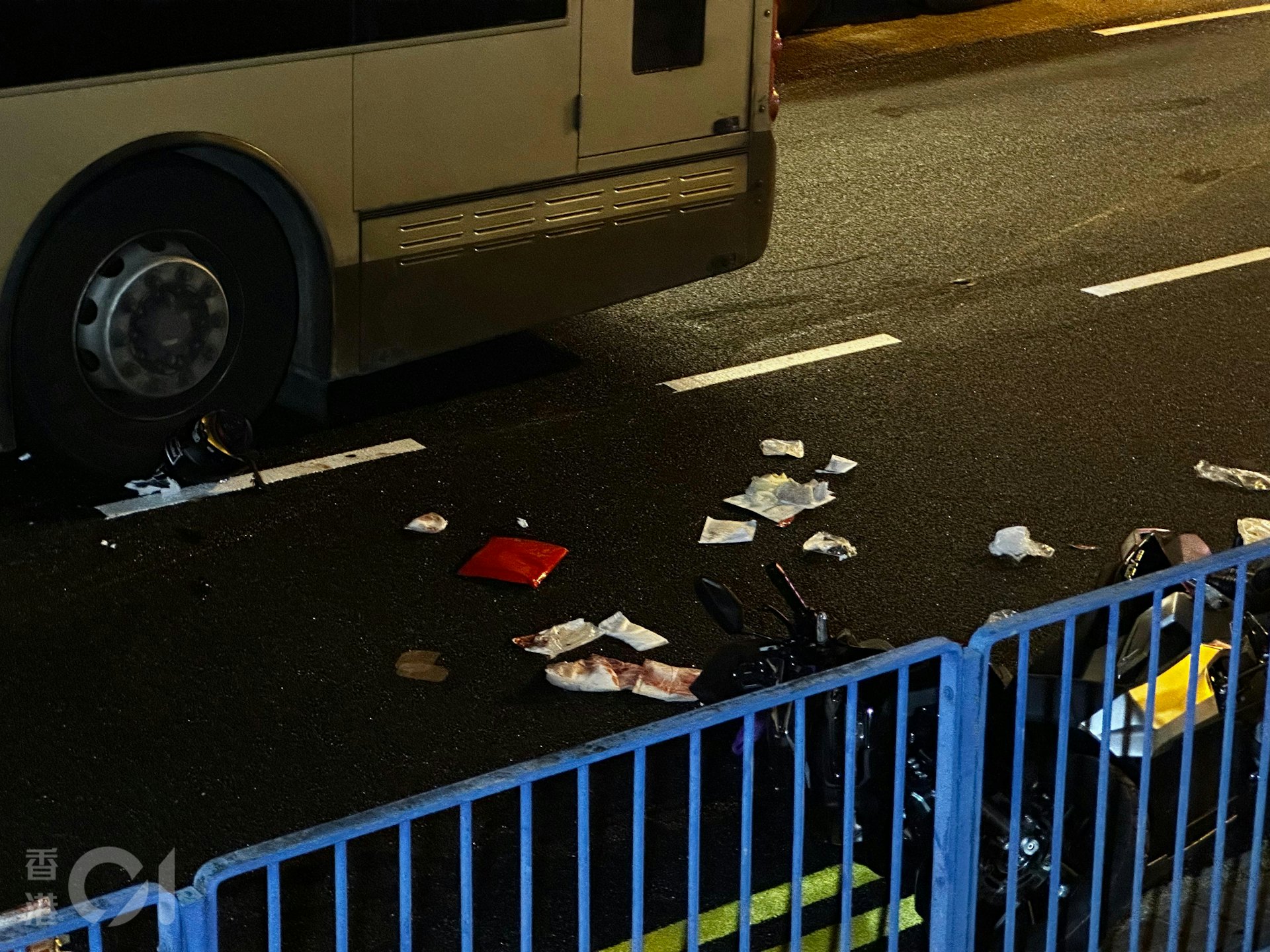 ( U% ]3 b/ |+ O$ @2 K電單車翻倒路邊,大量雜物四散一地,包括染血紙巾及紗布等。(羅日昇攝)