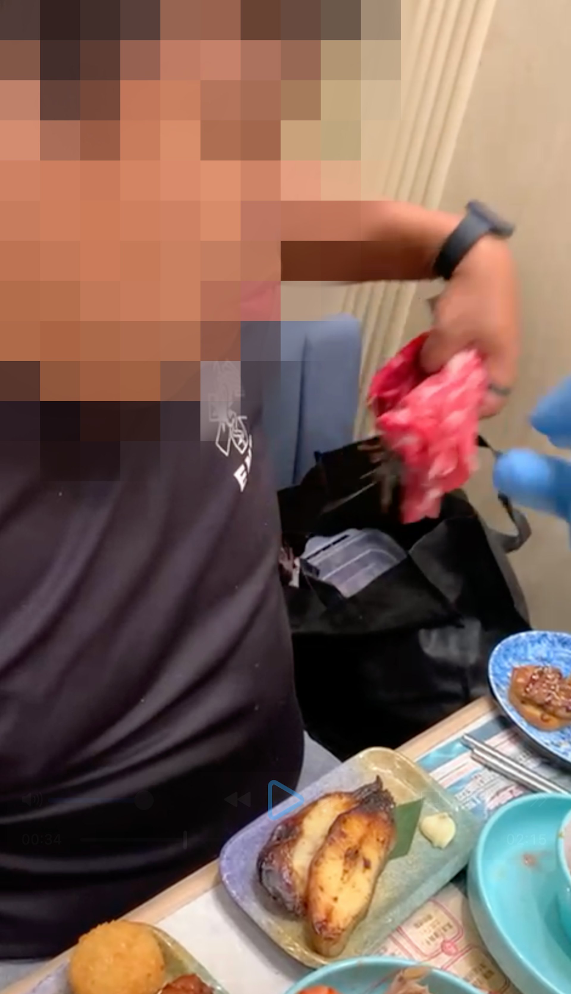 & R/ J9 C; R: F讀者轉發予《香港01》的影片,亦有在社交平台上瘋傳。影片所見,男職員手持托盤,走近一張二人檯,客氣地向男女顧客表示:「CCTV打電話落嚟,見到係咪唔覺意攞咗啲嘢食落個袋?」起初兩人未有承認,職員再禮貌勸喻:「麻煩攞返出嚟,因為睇住我做緊嘢,攞返出嚟就簡單啲,因為食物衛生啦始終都,食到全部可以係度食」。男子其後目無表情地從身旁一個黑色環保袋中,取出一個膠袋,袋內裝載了海產,職員頗為震驚稱:「咁大袋」。1 R" N2 q9 L2 Z
